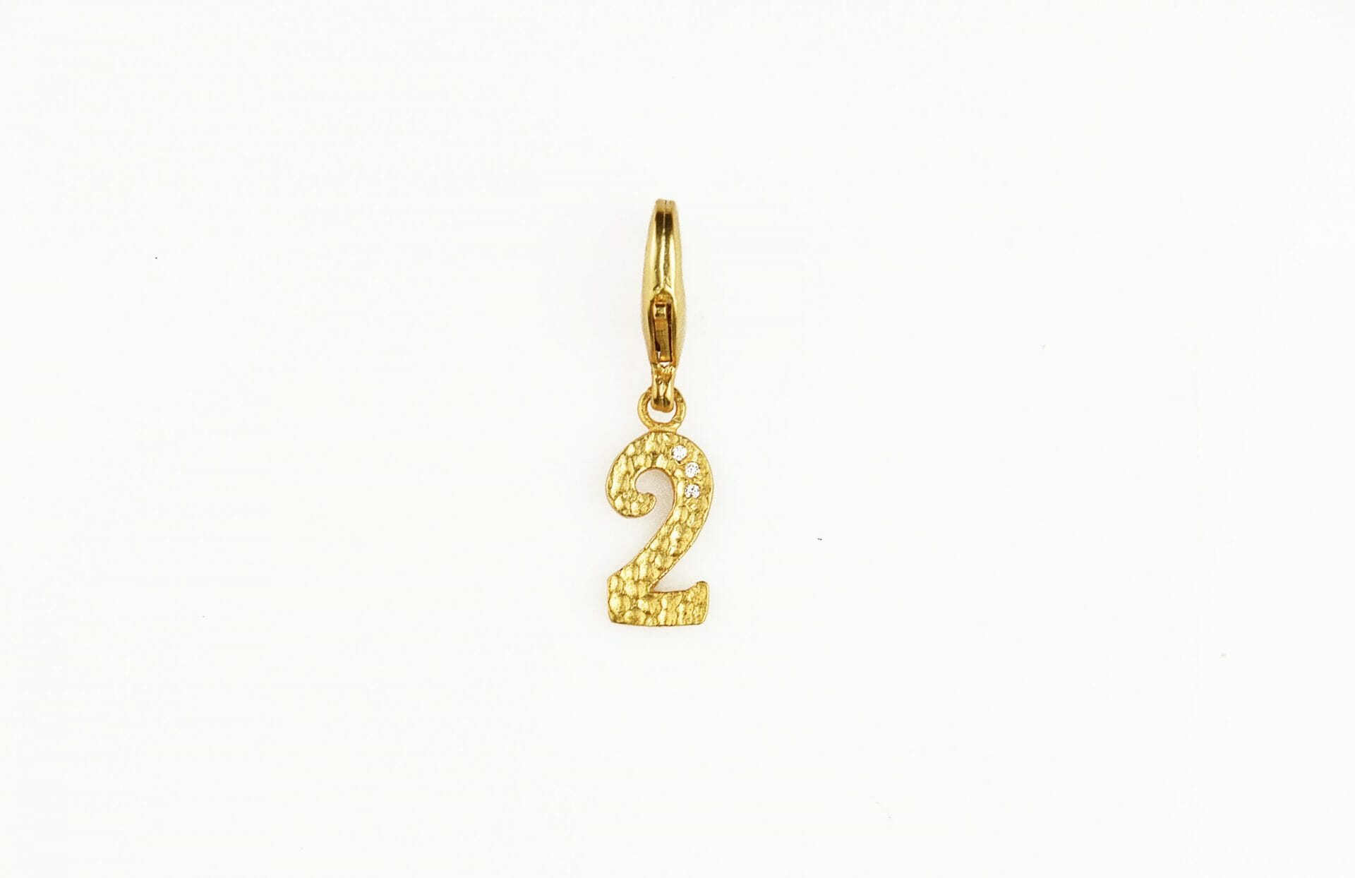 Charms by Zariin. Pick and choose your charms to add a personalised touch to your jewels. Be it your lucky number or your birthday, flaunt it and make your jewelry piece reveal a bit of yourself. The charm comes with a lobster clasp which can be used to hook on your favorite necklace, bracelet or wherever you think you can fix it. The '2' is 22kt Gold studded with three cubic zirconiums.
