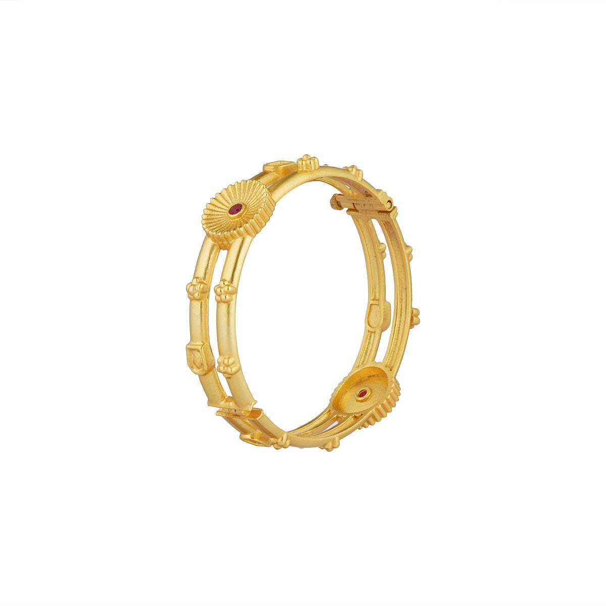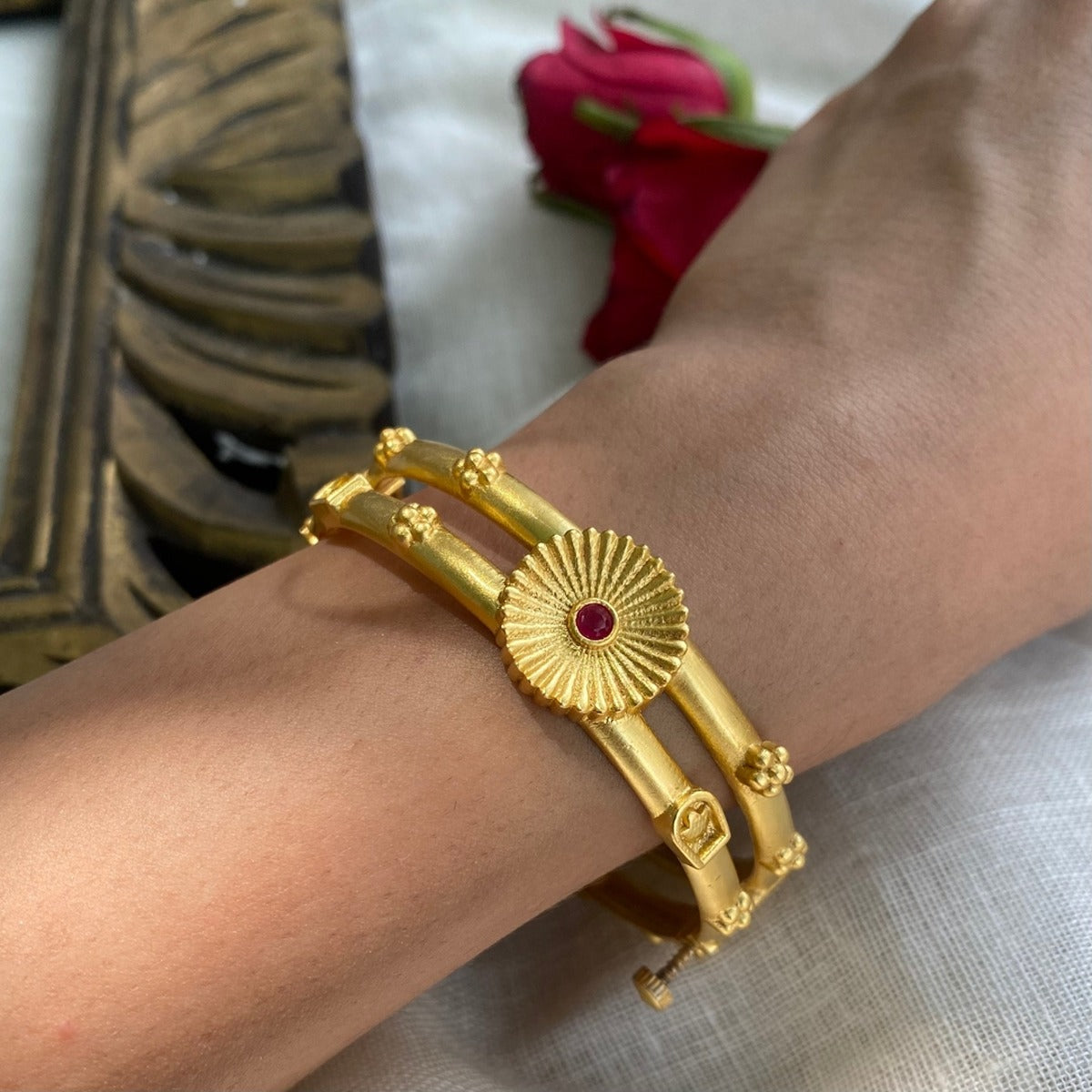 This is a fashion forward 22kt gold plated bangle inspired by the antique temple jewellery but presented in its sleek modern avatar. The bangle is a combination of two bangles welded together with floral embossed motifs which are an element typical of temple jewellery - embossed and intrcately detailed. The motifs are Chatham rubies for colour and a regal touch. Rooted in India, the bangle is an interesting addition that works well on its own or stacked with other pieces for a dressier approach.