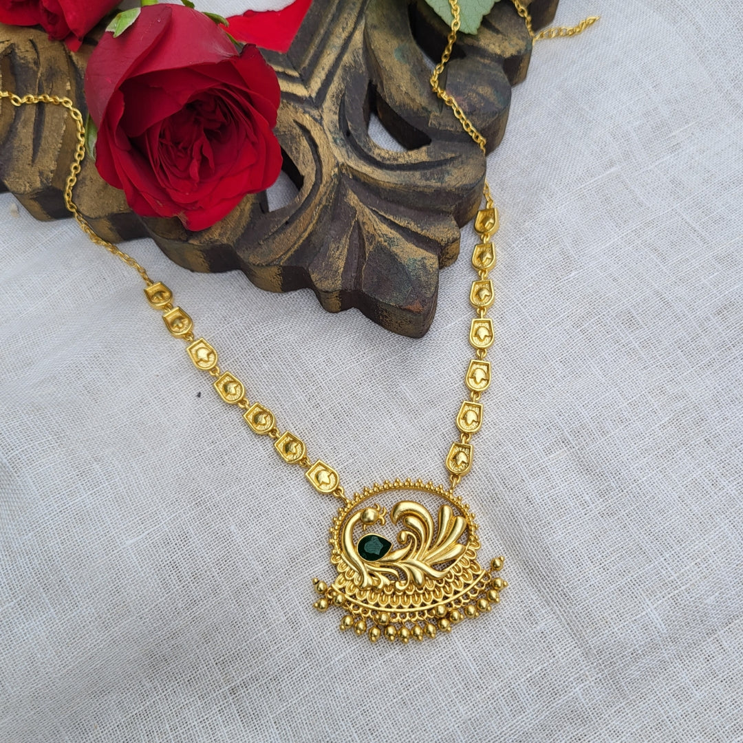 This is a lovely 22kt gold plated pendant necklace inspired by the traditional temple jewellery. Temple jewellery is known for its intricate detailing which is reflected beautifully in this necklace's peacock inspired motif on the pendant. The depiction of the bird in temple jewellery is sginifcant one - as not only is the bird an artistic choice but also reflects spiritual, devotional and ceremonial association. The necklace uses the metal embossing technique which is very typical of temple jewellery which enables the detailed designs and depth to the jewellery.