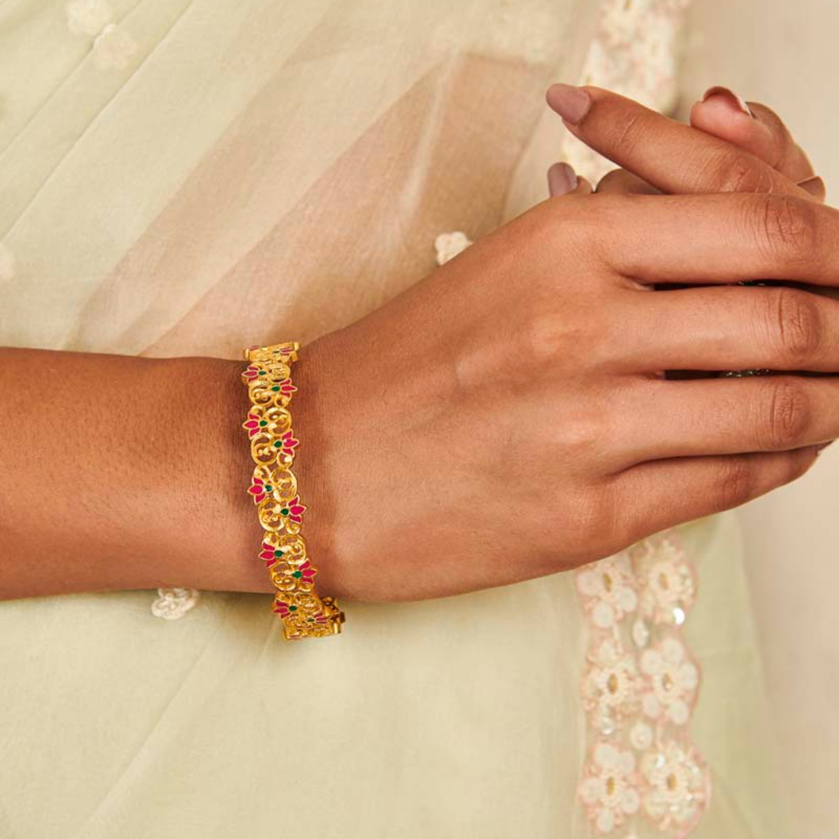 Bangles are an essential accessory to complete your festive looks. This delicate bangle is all things pretty with a filigree base and enameled lotus motifs in the combination of Pink and Green. The lotus is rooted in Indian aesthetics and enhances the character of the jewel.