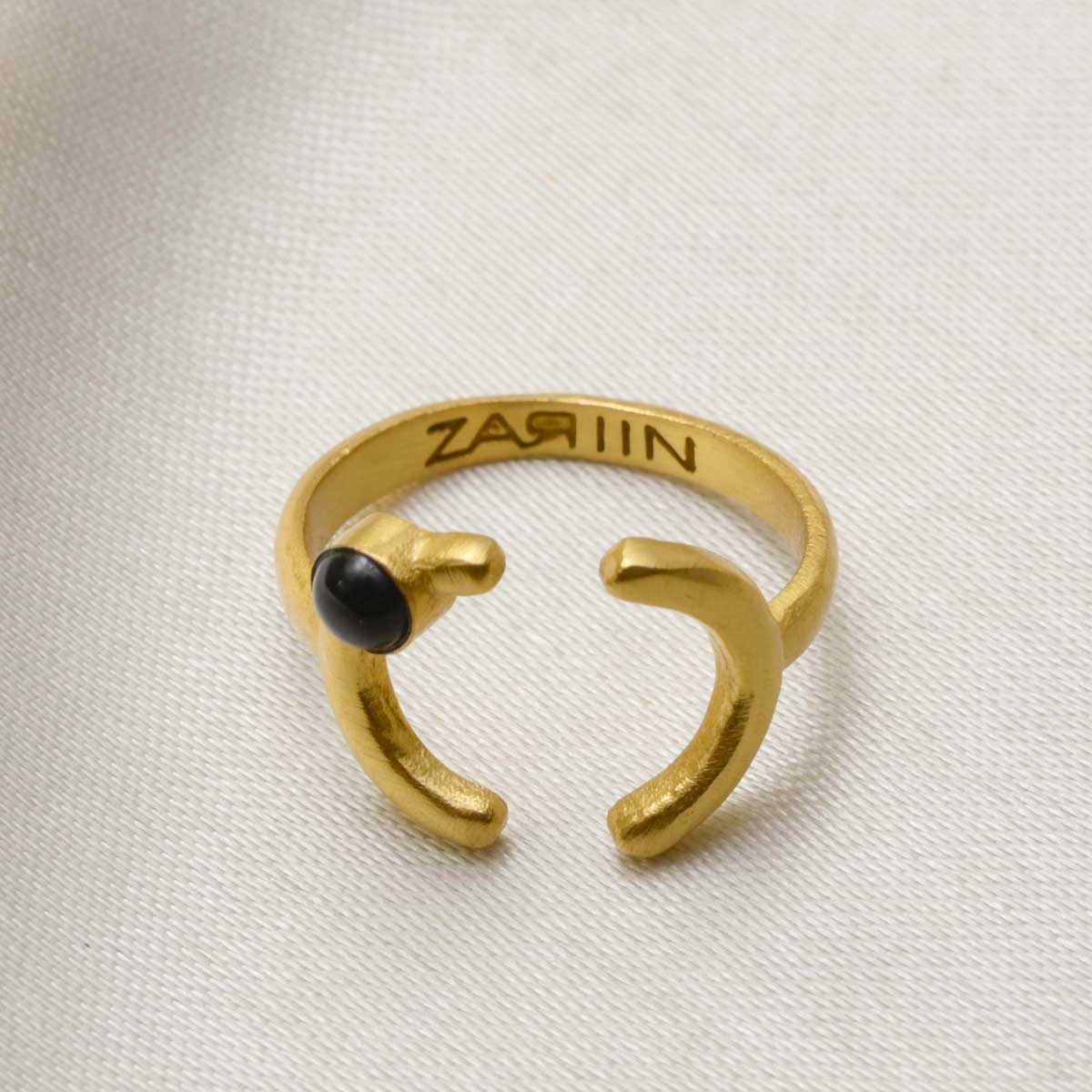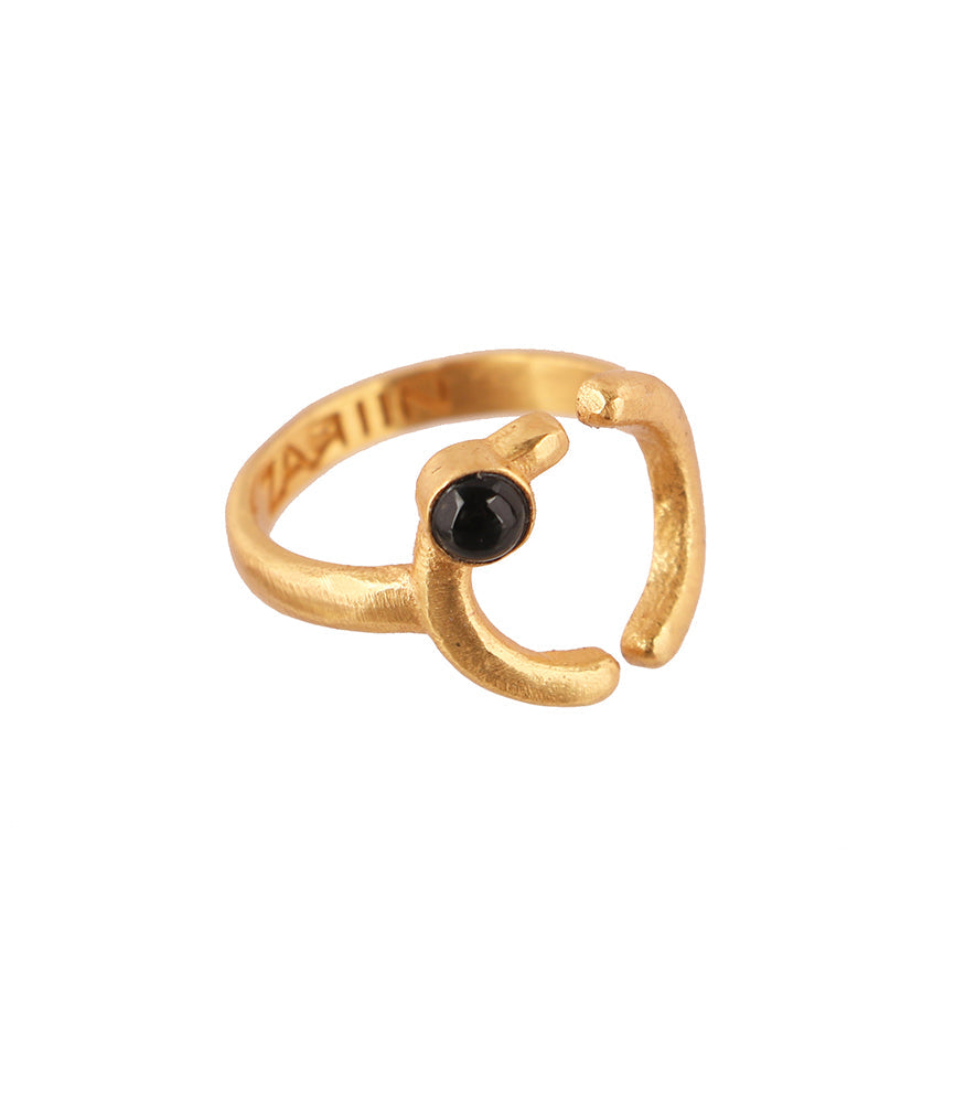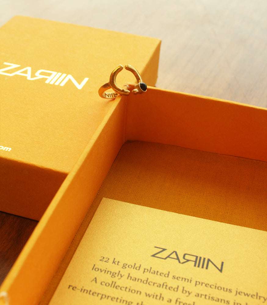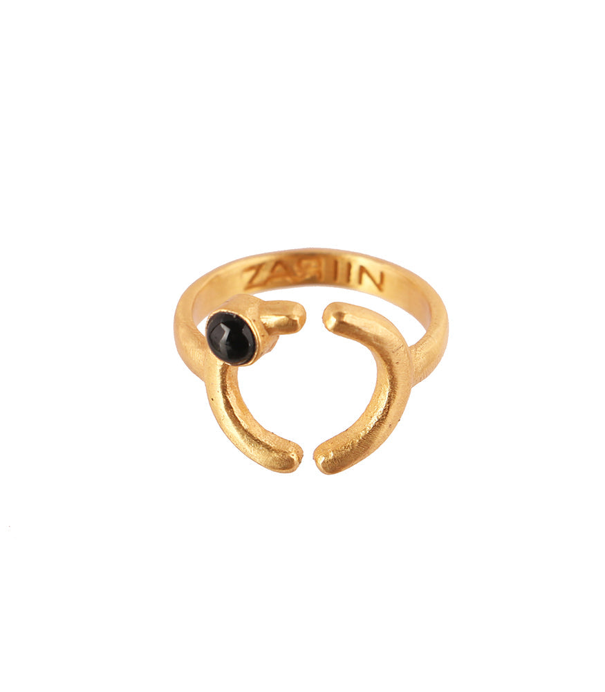 We love stacking rings for the mix-n-match and playful element that they come with.The idea of creating different looks and wearing it with a fresh appeal is a luring and a lucrative one. This stacking ring captures the classic Zariin aesthetics with a minimal motif that is offcentered with a Black Onyx. 22kt Gold ring.