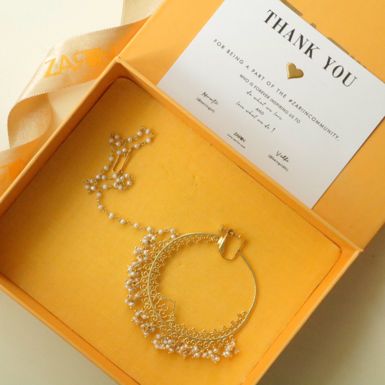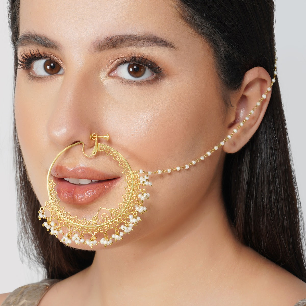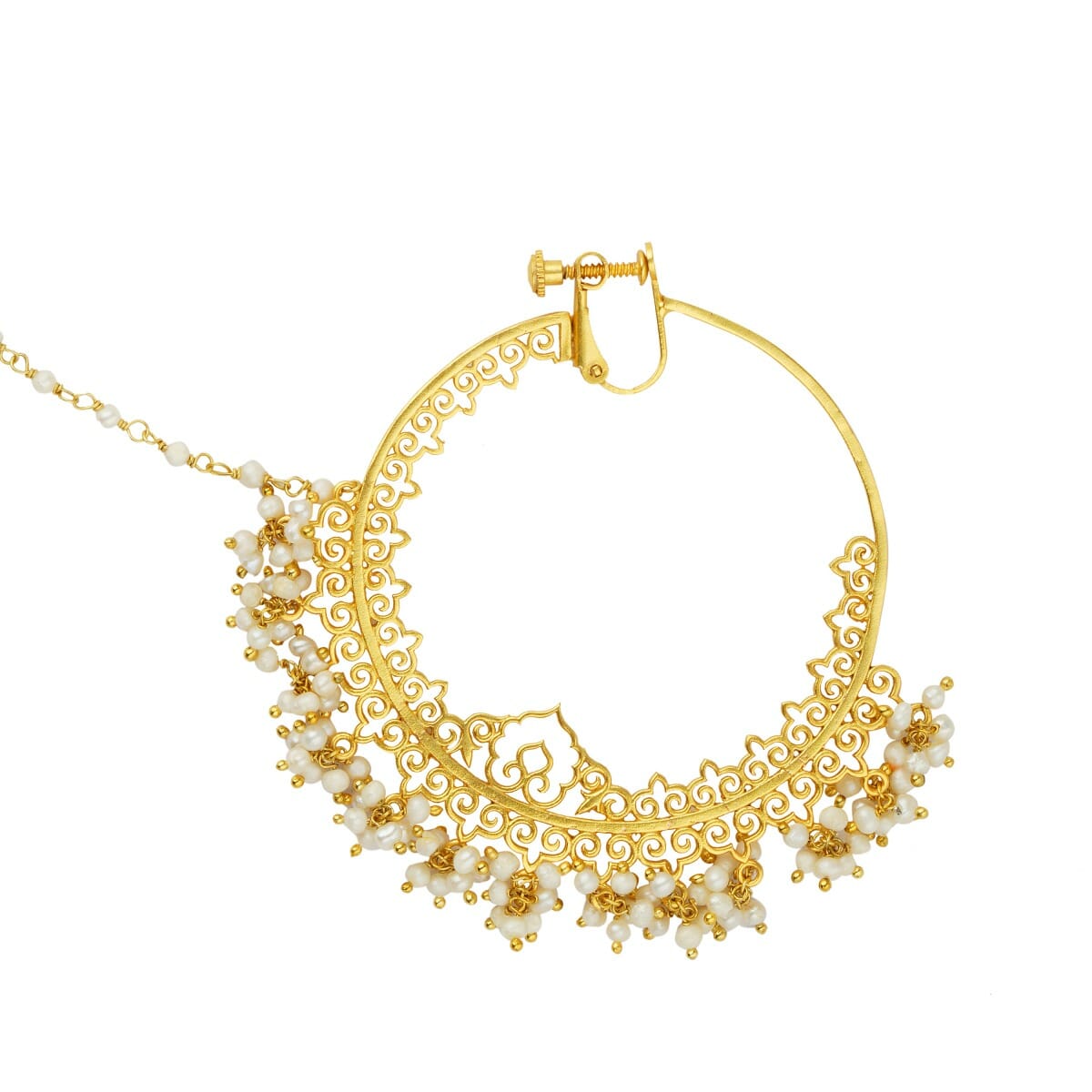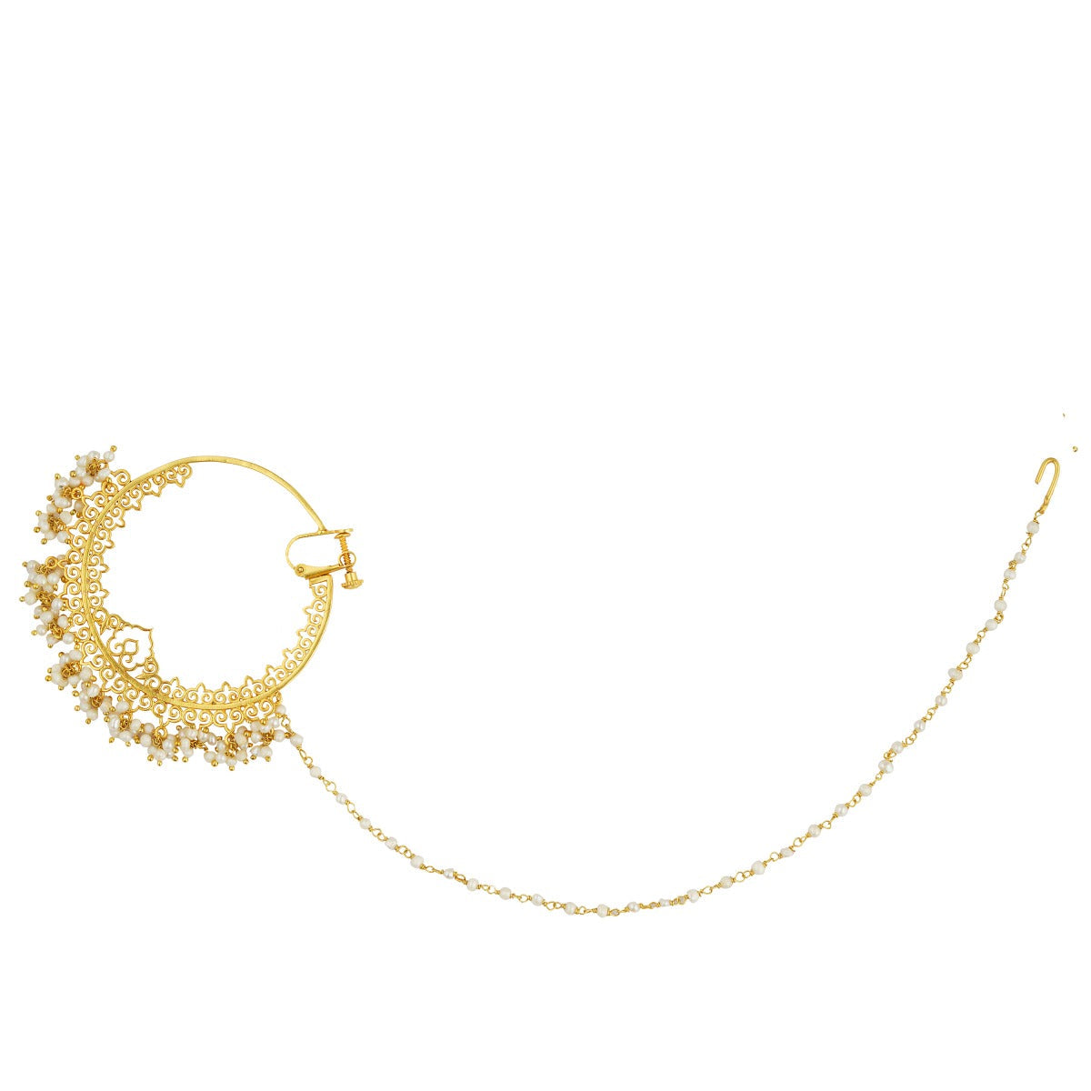 The beauty of the moon rests on this delicate nath. Zariin offers you a timeless piece that accentuates the intricacies of pearls and envisions you as a chaand ka tukda.