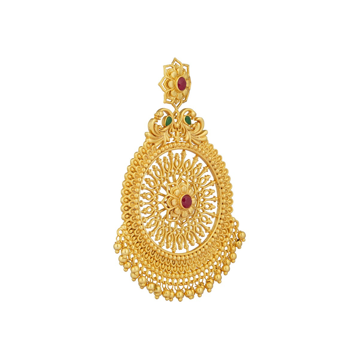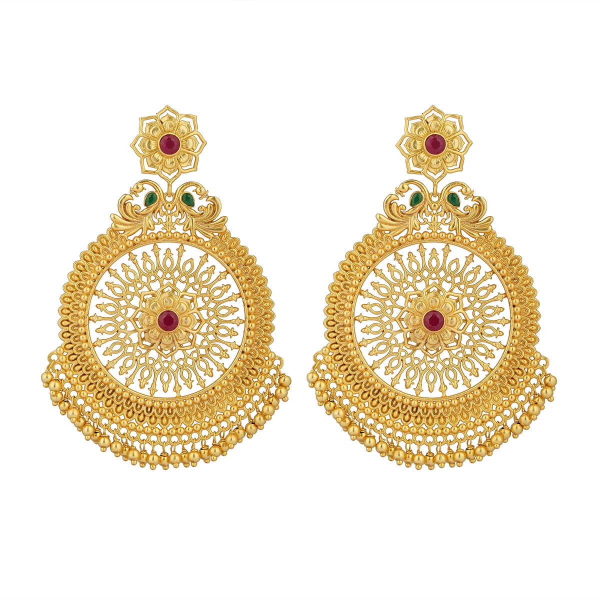 These opulent 22kt gold plated statement earrings have been designed to make a grand impression and stand out as centrepiece of your look. The earrings blend embossed elements and motifs inspired by traditional temple jewellery with the delicate intricacies of filigree work. Together these details present a stunning creation that is dressy and refined. Ideal for special events or formal gatherings. The floral motif is studded with Chatam ruby and the peacock motif is studded with Chatham emerald - the colour combination of the stones too is a typical one of temple jewellery.