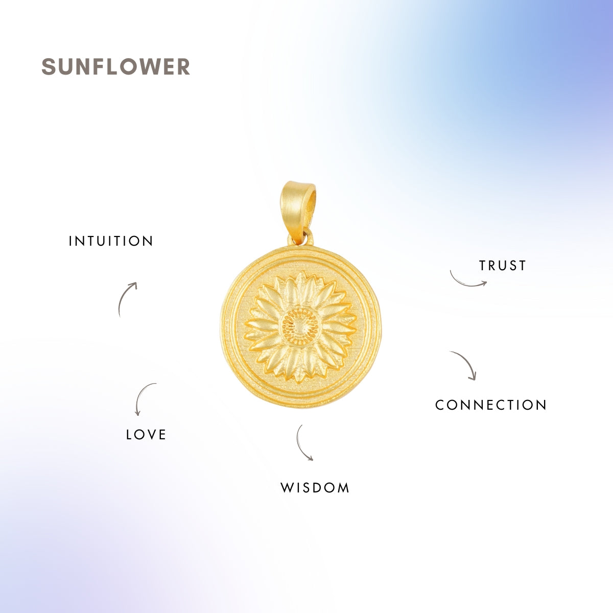 This coin pendant comes with beautiful details of a sunflower. Sunflowers symbolise loyalty and adoration. Because of their association to the sun, sunflowers are known for being a happy and a positive flower. The flowers are always trying to find the light symbolising loyalty, long life, vitality and good luck.
