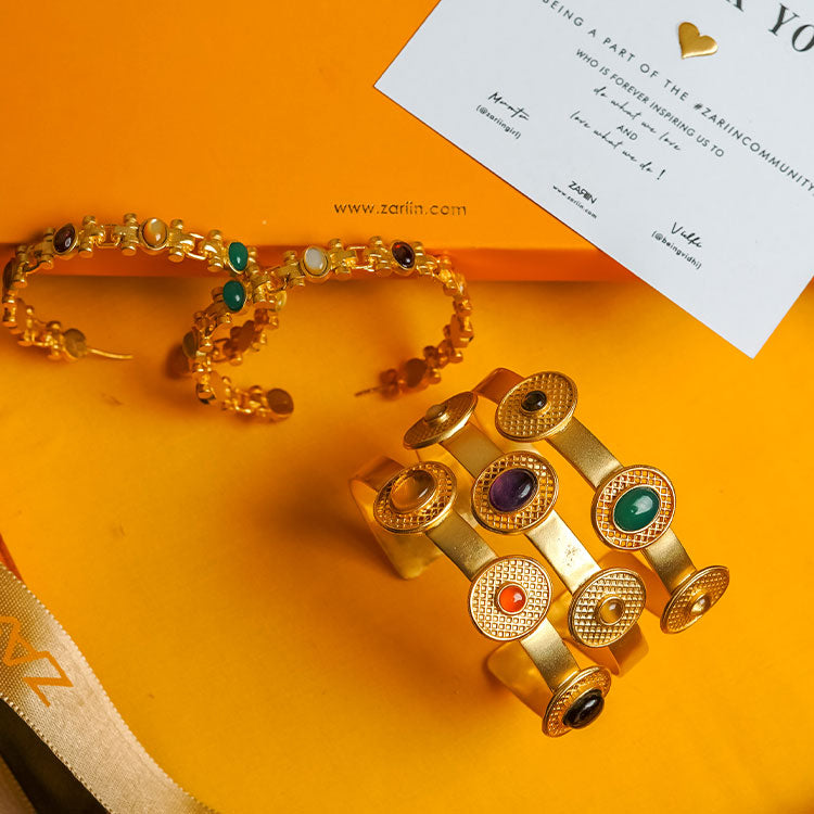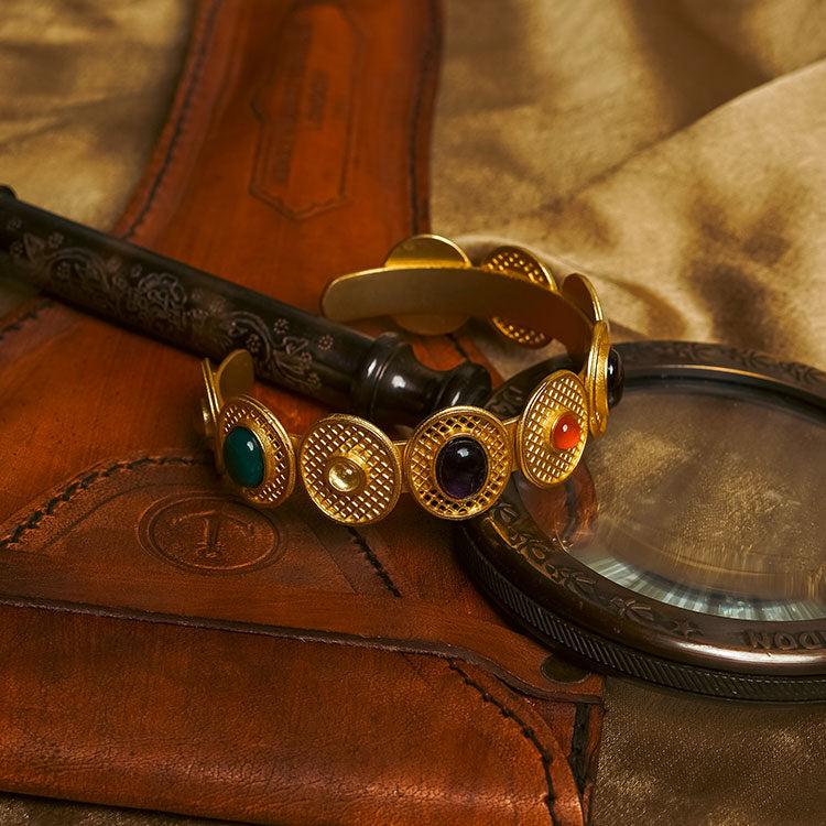 A sleek 22kt gold plated cuff bracelet studded with 9 cosmic gemstones inspired by traditional Navratna jewellery but presented in a contemporary wearable style justifying the modern day aesthetics. The bracelet includes glass Cat's Eye, Green Onyx, Crystal Quartz, Amethyst, Carnelian. Garnet, Mother of Pearl, Citrine and Smoky Quartz.