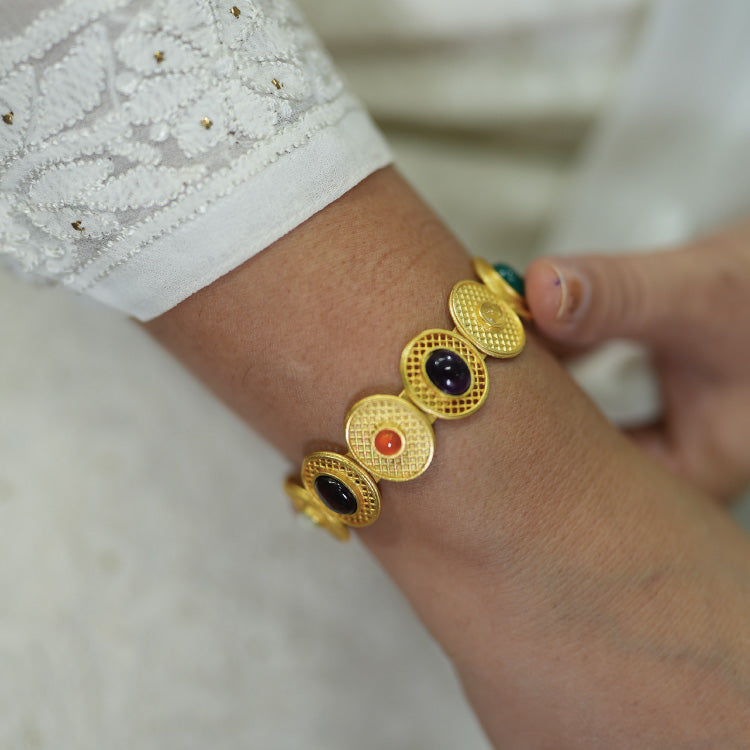 Traditional Navratan jewellery presented in the form of a stylish cuff for the modern woman who uses traditional knowledge to her benefit.