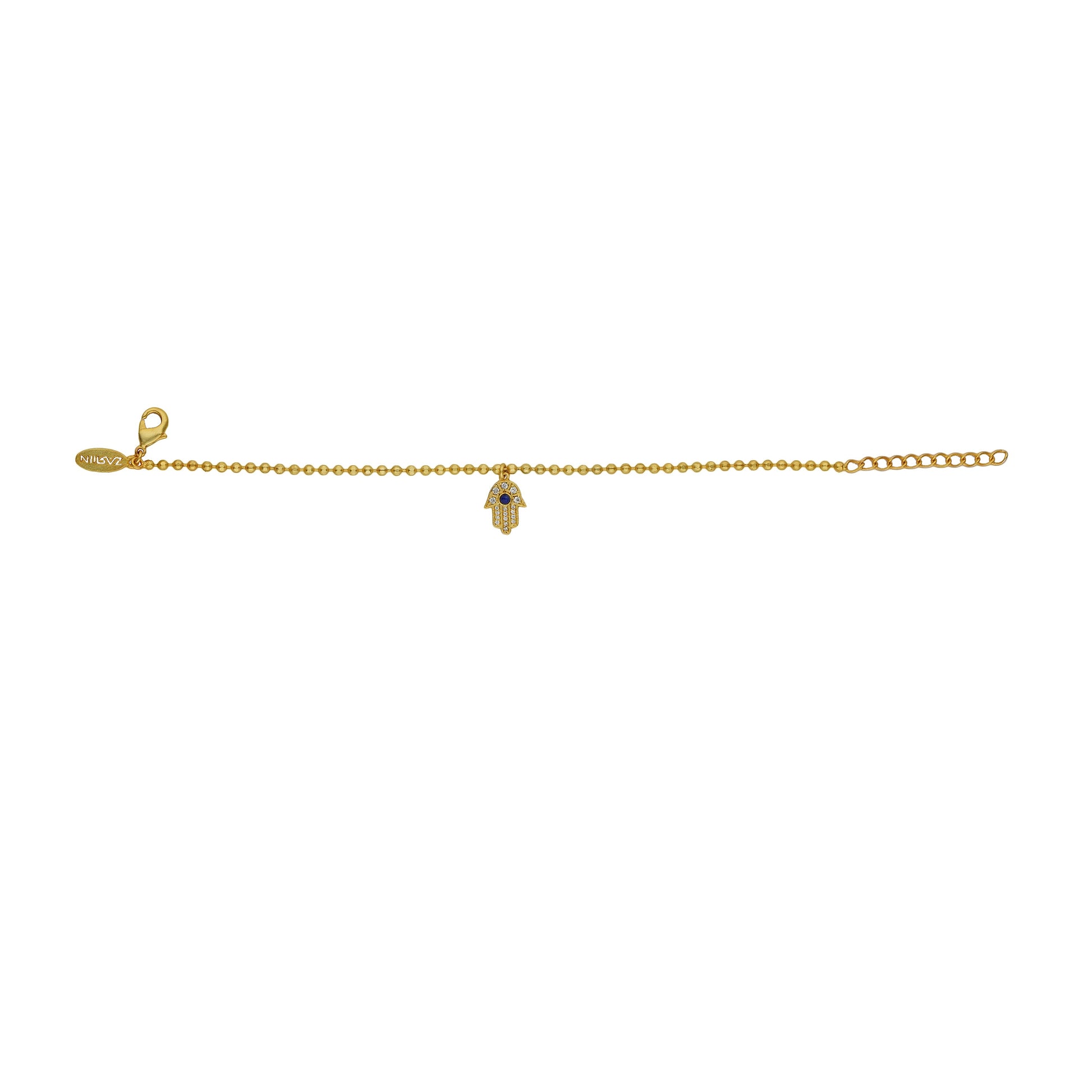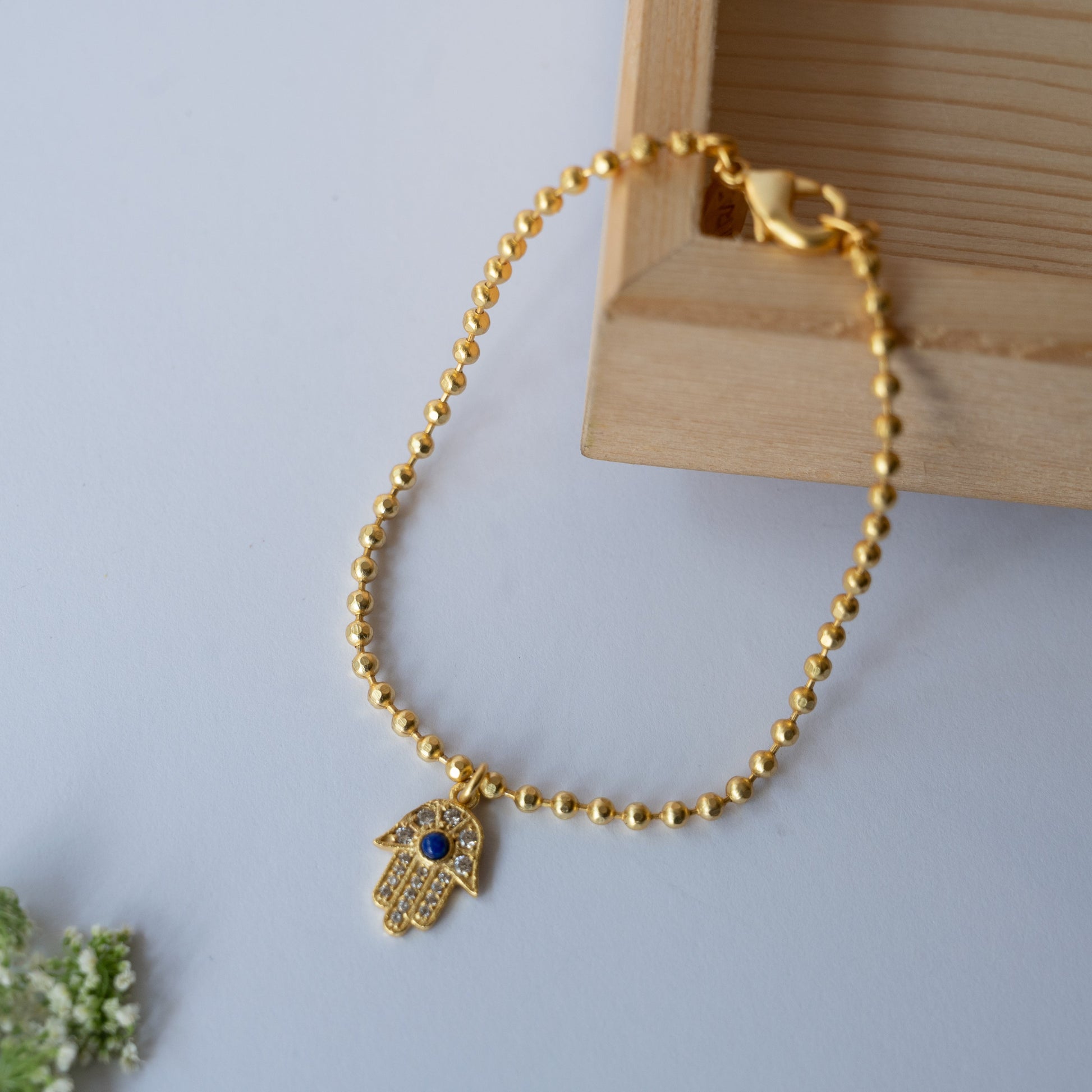 This is a 22kt gold plated bracelet with dot chain and a Hamsa Hand drop that is studded with Cubic Zircon and Lapis Lazuli. The bracelet is a stylish amulet that can be worn everyday to ward off any negative energies. A thoughtful and a caring gift for your mother on Mother's Day or her birthday!