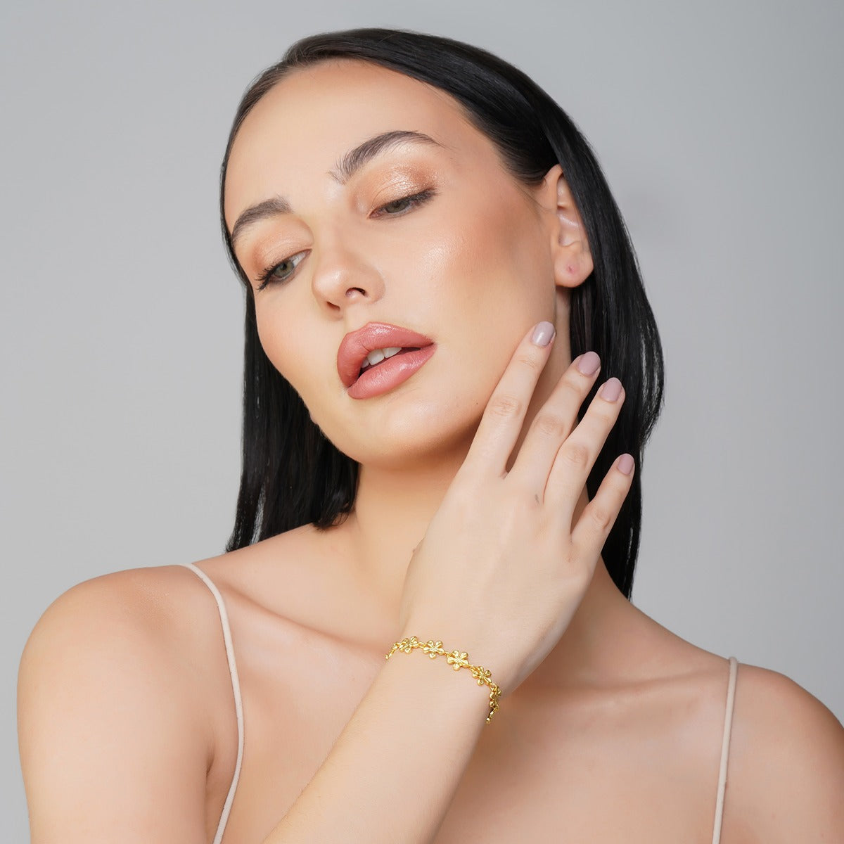 22kt gold plated choker bracelet with a row of floral motifs.We capture the joy of a floral bloom in this beautifully detailed sculptural bracelet. Use the bracelet to enhance your everyday outfits with the dash of gold imparted by it. Let it be a wonderful reminder of your feminine allure and blossom to your best, everyday. Stack it with other bracelets for a more is more approach.