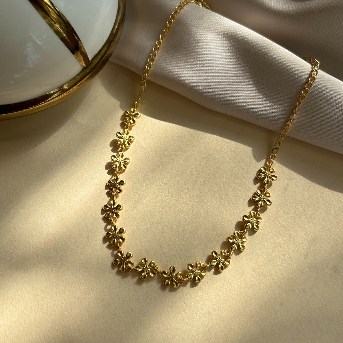 22kt gold plated choker necklace with a row of floral motifs. We capture the joy of a floral bloom in this beautifully detailed sculptural necklace. Use the necklace to enhance your everyday outfits with the dash of gold imparted by the necklace. Let the necklace be a wonderful reminder of your feminine allure and blossom to your best, everyday.