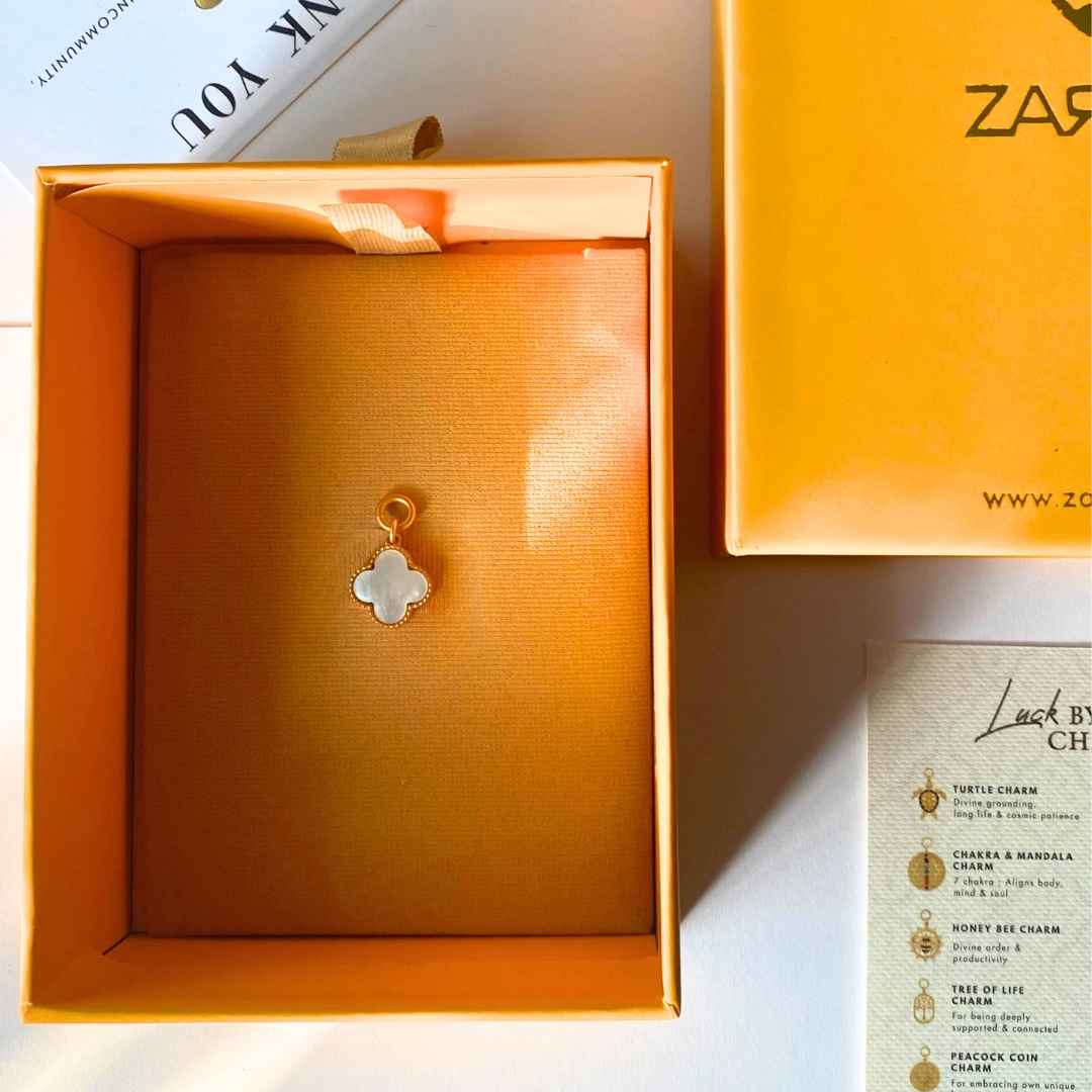 Looking for a charm that brings you some luck while adding character to your stack? This is a minimal yet striking 22kt gold plated charm inspired by the form of a four leaf clover and detailed with the luminous Mother of Pearl. The four leaf clover represents luck and Mother of Pearl represents gentle, nurturing energy.
