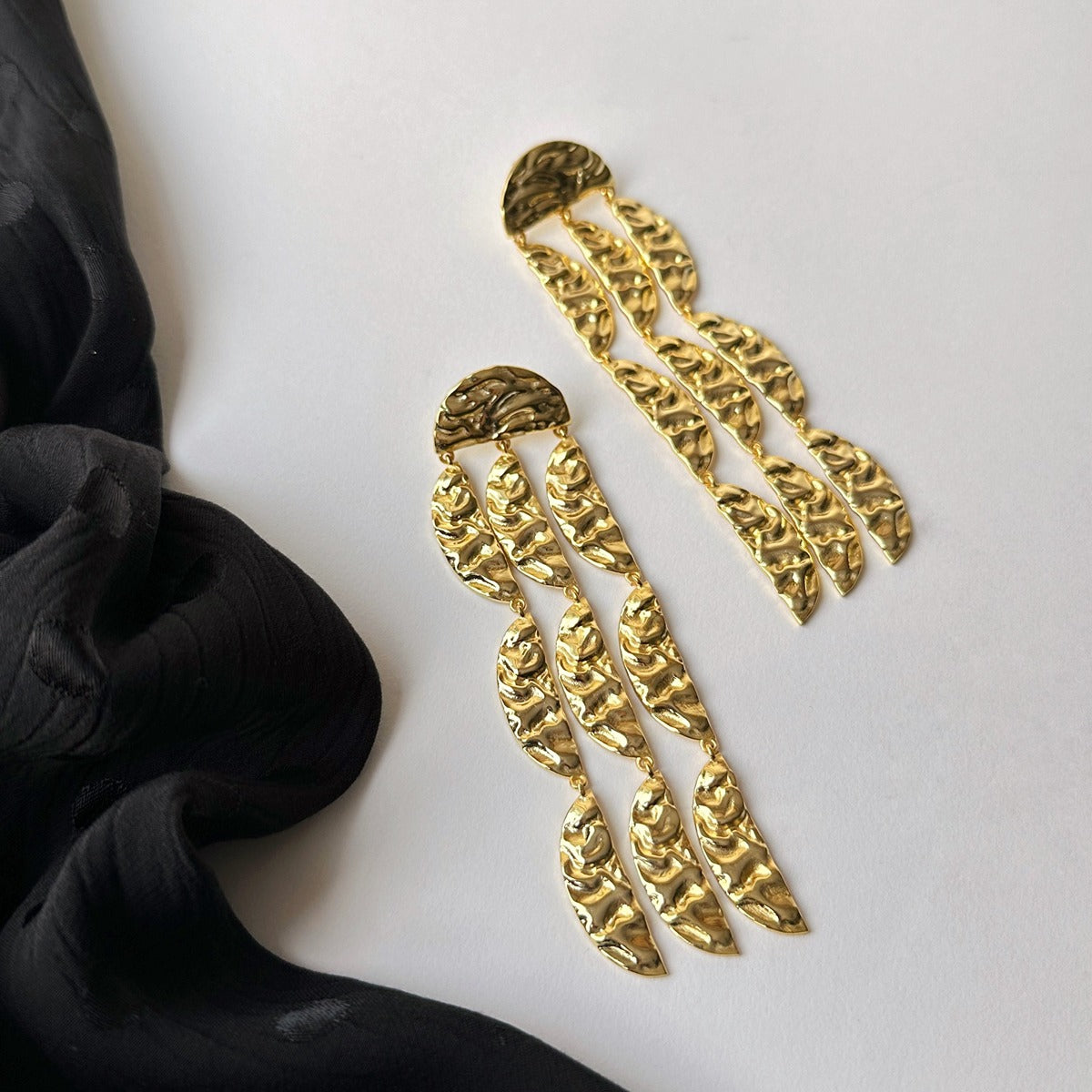 22kt gold plated chandelier earrings that capture the 80s inspired glam yet are presented in their most modern avatar. Crafted of paper thin sheet metal, the earrings are impactful yet light to wear making them the perfect party earrings. The all gold tonal look makes them easy to style and go with most outfits. Think breezy holiday kaftans, crisp white shirt with denims or your most fashionable dresses - the earrings justify every kind of outfit while ledning their own powerful, bold touch.