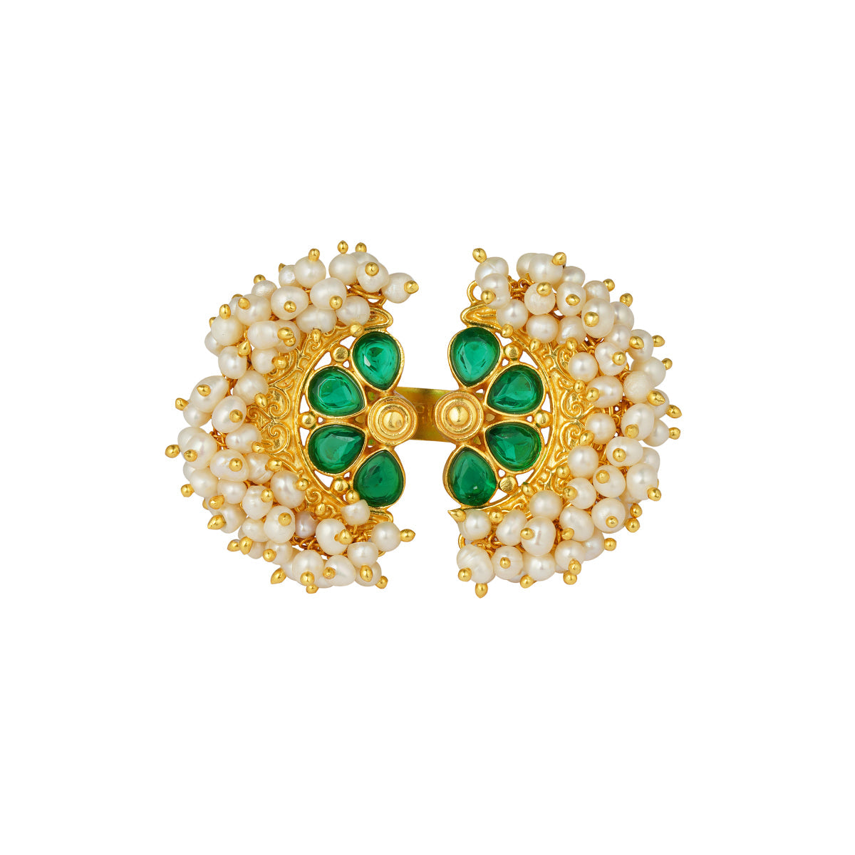 This 22kt gold-dipped accessory with green czs give a tasteful appeal to your hands, making your styling routine simple and straightforward. The delicate filigree detail adds a Mughal touch, and the dreamy pearls add a distinct appeal to it.
