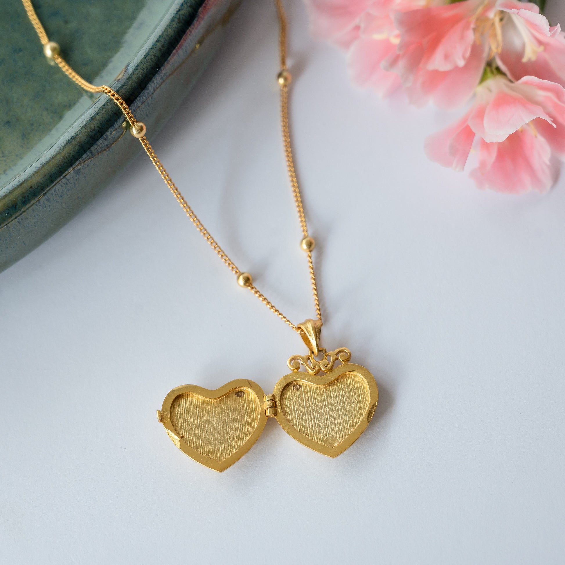 This is a 22kt gold plated necklace with a dot chain and a heart shaped photo locket. The locket is detailed with blue enamel heart motif. It's a meaningful necklace to keep a picture of your precious ones or some touching words close to your heart. The necklace would make a thoughtful mother's day gift.