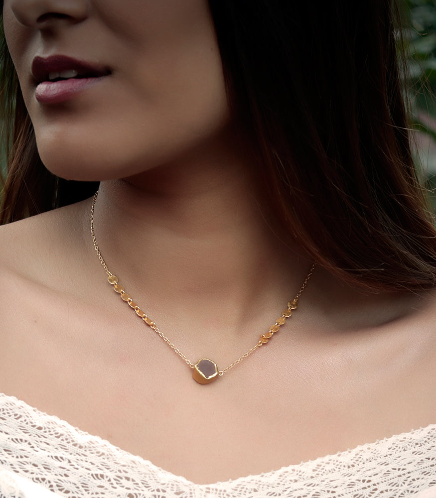 The current trends are all about naked jewelry. What is that you ask? Minimal jewelry that is delicate, subtle and extremely light. This rose quartz centered necklace is a timeless piece that is as casual, formal or dressy as you make it to be. Ou will have a lot fo fun layering this necklace and adding interesting dimensions to your look. 22kt Gold necklace.