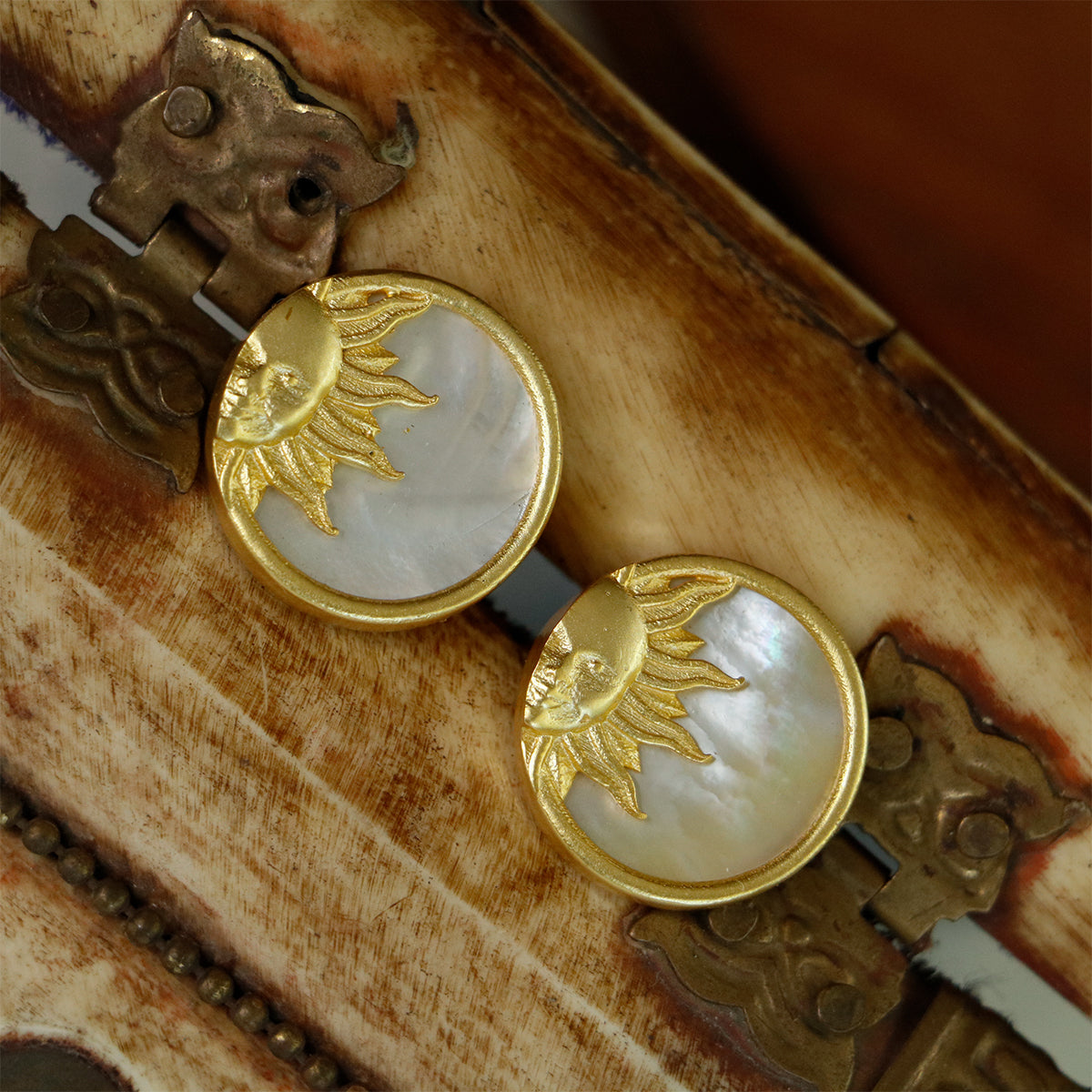 Tap into the supreme energy of the Sun with this radiant set featuring a 22kt gold-plated pendant necklace and matching stud earrings, both detailed with a Sun motif over a Mother of Pearl base. A powerful symbol of vitality, protection, and confidence.