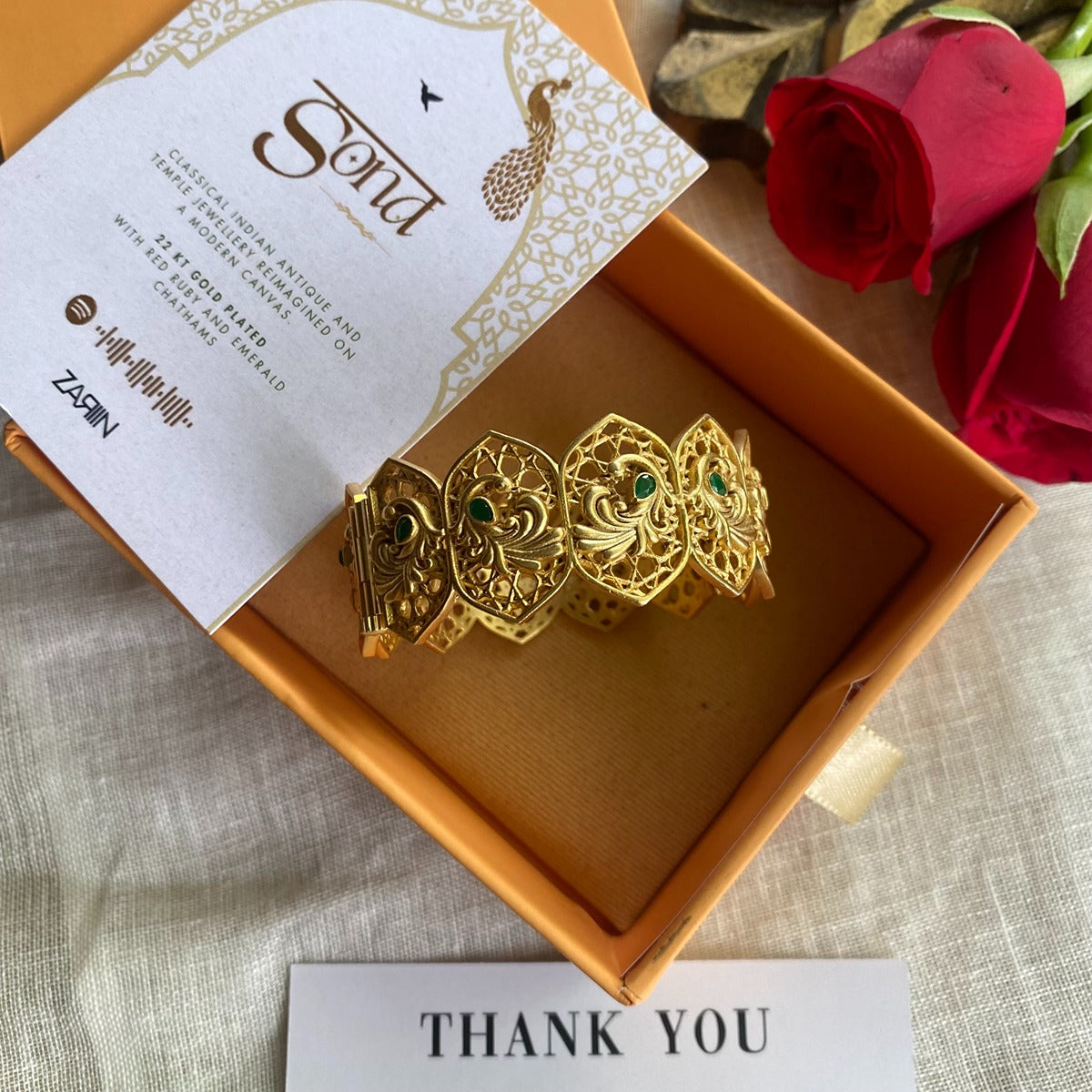 This is 22kt gold plated kada, a traditional bangle which is inspired by temple jewellery and is intricately detailed with graceful peacock motifs. The depiction of the bird in temple jewellery is significant one - as not only is the bird an artistic choice but also reflects spiritual, devotional and ceremonial association. The bangle uses the metal embossing technique which is very typical of temple jewellery which enables the detailed designs and depth to the jewellery.