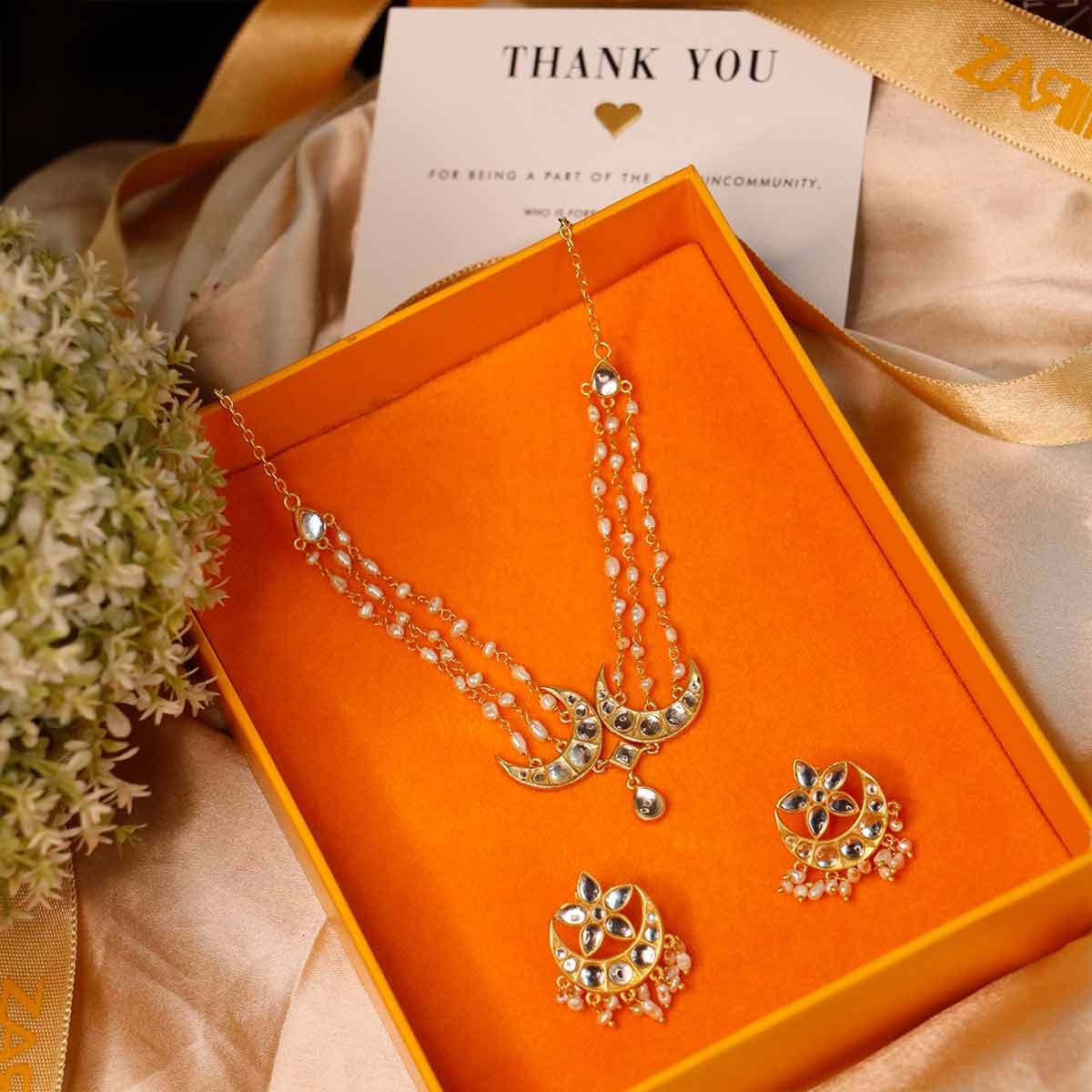 This is a gift box with 22kt gold plated choker necklace and earrings with chaand motif set with mirror polki and freshwater pearls. The jewellery is perfect occasion or festive wear for a minimalist as it imparts subtle glamour to your look. Makes a wonderful wedding gift or if you want to gift a piece fo India to someone.
