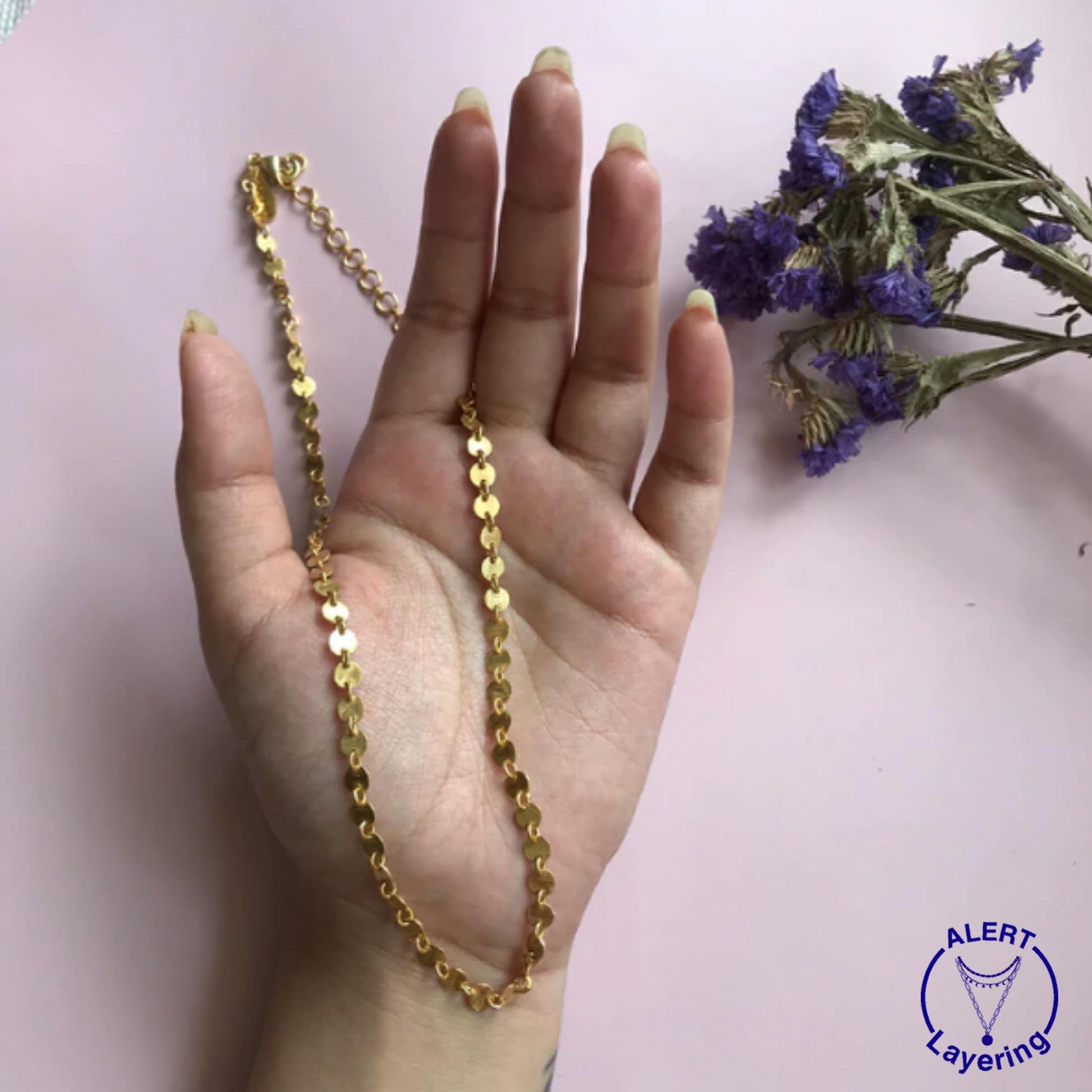 This is not your usual choker - usually you'd expect a necklace of the kind to be bold and dominating. This necklace is quite the opposite with a polished design approach where minimalism is celebrated. Small Gold discs form the links for an understated piece for those who find chokers too OTT for their taste. The necklace is also a layering delight. All you need to do is add a longer one. 22kt Gold necklace.