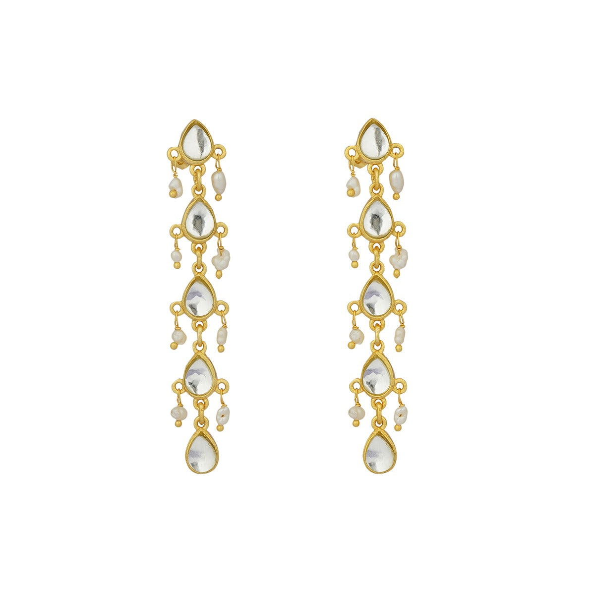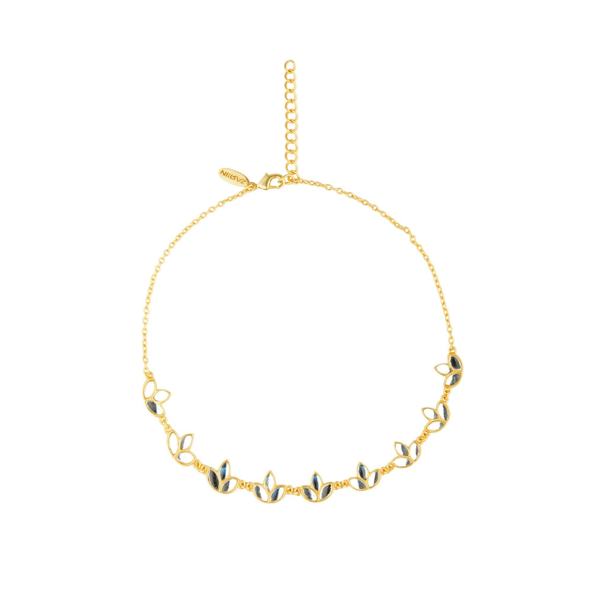 This is a gift box with 22kt gold plated choker necklace and long earrings to match. The sleek, delicate choker is crafted with a lace of lotus inspired motifs set with mirror polki and freshwater pearls. The jewellery is simple and minimal yet festive and can aptly be used with your occasion wear when you don't want something too OTT. Makes a wonderful gift for a minimalist or who likes thrives on simplicity.