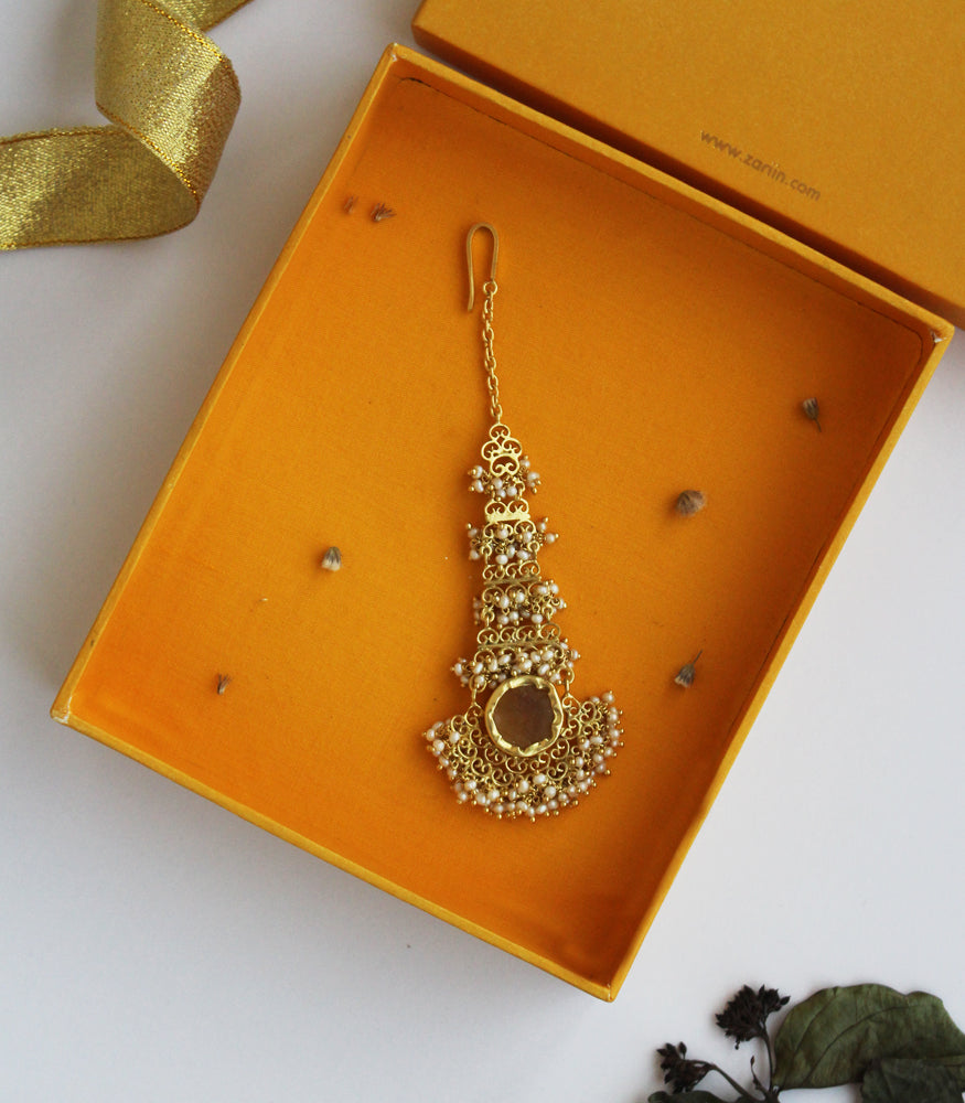 We are talking indi-chic. A glamorous piece of maang tikka can add wonders to your look and can instantly add a wow-factor to your occasion wear. A one step process to dressing up, this 22kt Gold maang tikka is set with uncut Citrine set against a charming filigree base laced with tiny bits of pearls.This stunning piece of jewelry makes dressing up so effortless.