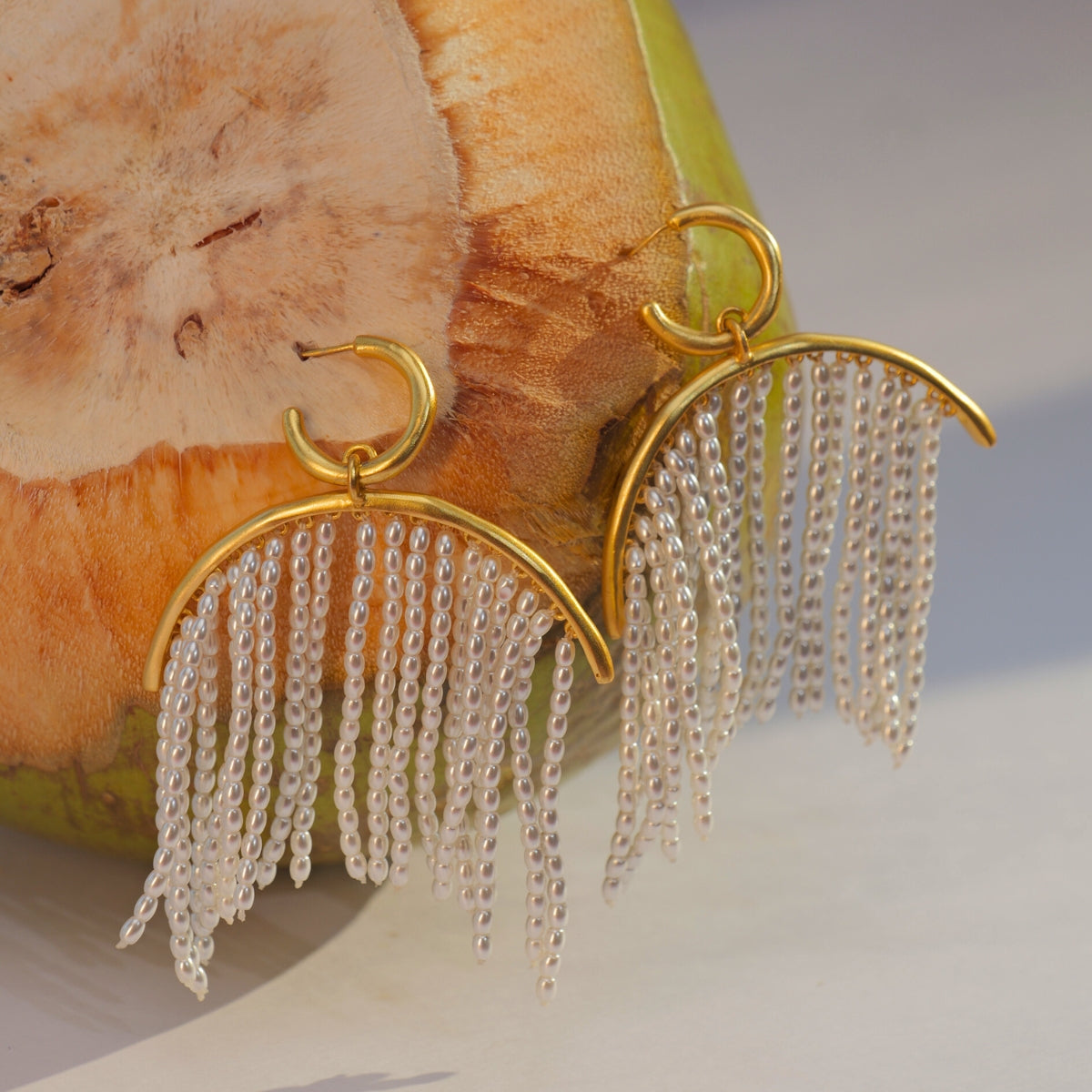 These ultra glam statement earrings, are a modern and contemporary rendition of pearl curtain earrings. Strings of pearls cascade from 22kt gold plated hoops which lend a dynamic and fluid movement to the piece adding to the visual impact of the earrings. Perfect for when you are looking for a truly statement pair to make a bold fashion statement. The earrings are polished, fun and truly impressive.