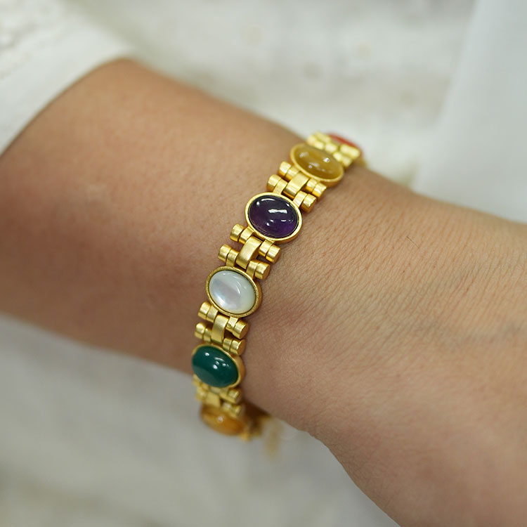 Traditional Navratan jewellery presented in the form of a stylish bracelet for the modern woman who uses traditional knowledge to her benefit.