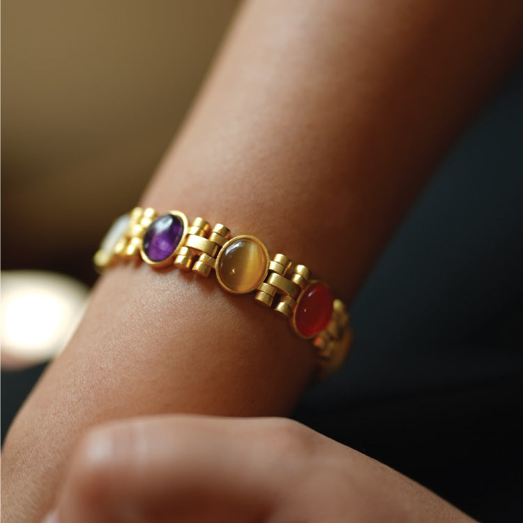 A stylish 22kt gold plated bracelet inspired by traditional Navratna jewellery but presented with modern aesthetics. The bracelet features 9 cosmic gemstones which include Garnet, Crystal Quartz, Carnelian, glass Cat's Eye, Amethyst, Mother of Pearl, Green Onyx, Citrine and Smoky Quartz.