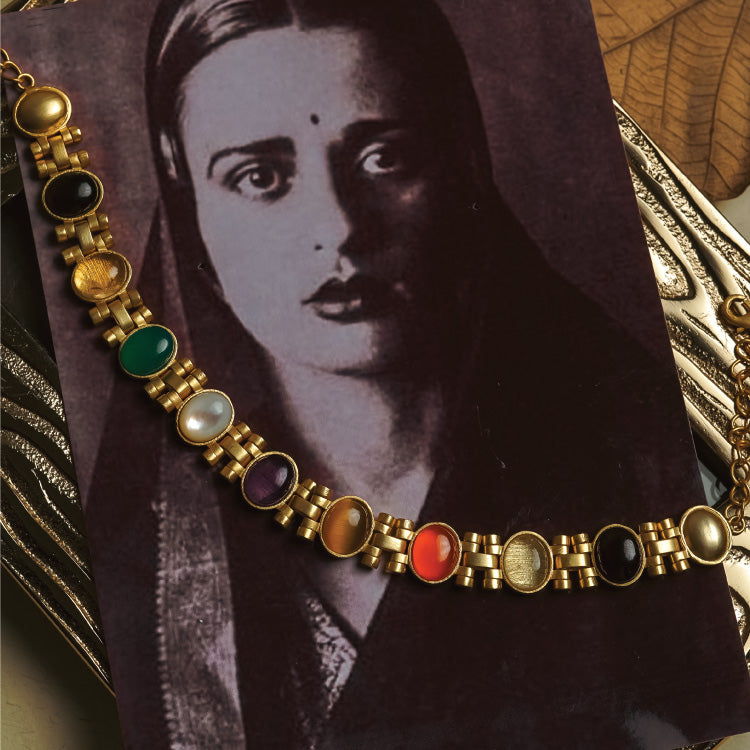 Traditional Navratan jewellery presented in the form of a stylish collar necklace for the modern woman who uses traditional knowledge to her benefit.