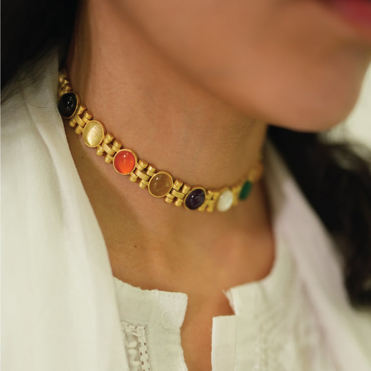 A 22kt gold plated choker necklace set with Navratna gemstones. The 9 cosmic gemstones include Garnet, Crystal Quartz, Carnelian, glass Cat's Eye, Amethyst, Mother of Pearl, Green Onyx, Citrine and Smoky Quartz.