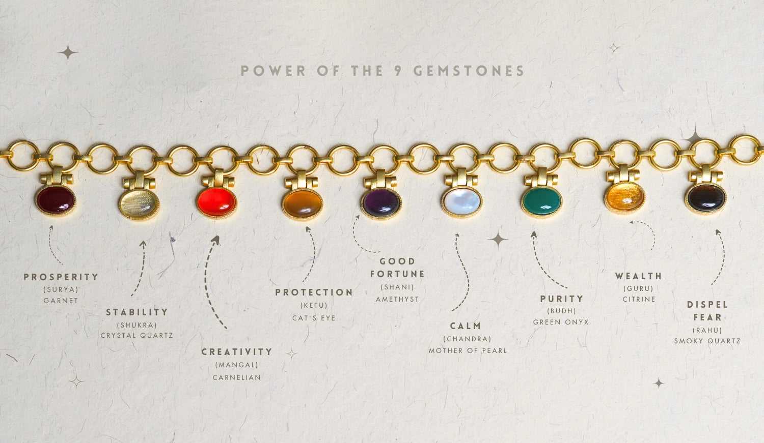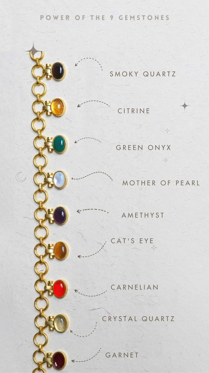 A classic 22kt gold plated Navratna ring set with 9 cosmic gemstones. Tap into the goodness of the gemstones associated to the 9 celestial bodies according to Hindu mythology without compromising on style. It includes Citrine, Amethyst, Smoky Quartz, Green Onyx, Mother of Pearl, glass Cat's Eye, Crystal Quartz, Garnet and Carnelian.