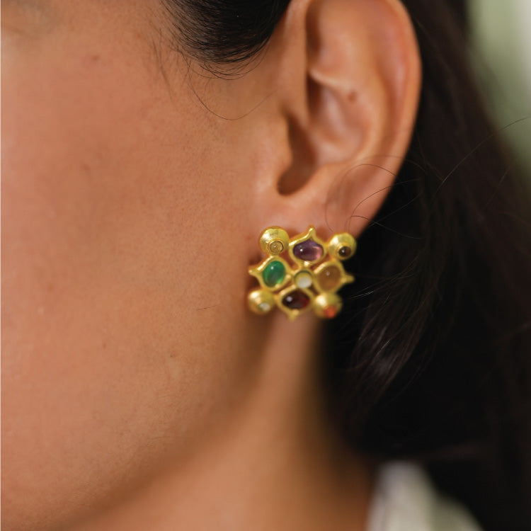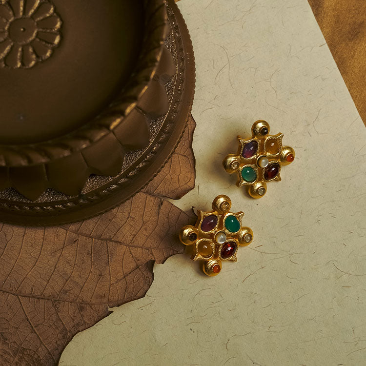 Traditional Navratan jewellery presented in the form of stylish stud earrings for the modern woman who uses traditional knowledge to her benefit.