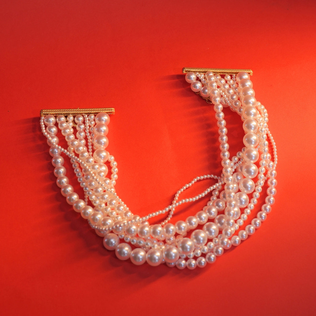 This is a dramatic multi strand choker necklace inspired by our eternal love for pearls. Just what you need to channel your inner Audrey Hepburn from the Roman Holiday, the necklace is indeed a perfect take on the iconic pearl necklace look. Not your usual pearl necklace, what makes the multilayered necklace stand out are the strands of pearls of different sizes making it eclectic and sophisticated. Pearls make the best travel jewellery owing to its timeless elegance, versatility and practicality. With this statement pearl necklace you can truly make a hard to miss impression.