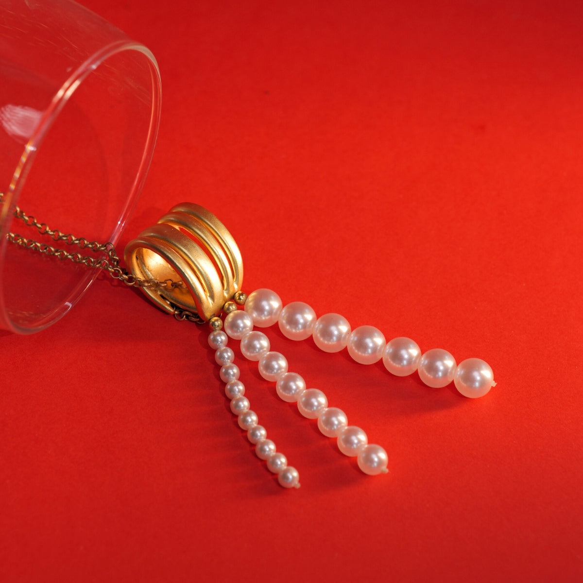 This is not your usual pearl necklace as we redefine pearls with truly modern aesthetics in the form of a 22kt gold plated pendant necklace inspired by an oyster inspired motif and dressed with pearl string drops with pearls of different sizes. It’s eclectic, unusual, lightweight and interesting making it just perfect go-to and travel accessory. You can finish the look with matching earrings from the collection for a coordinated look.