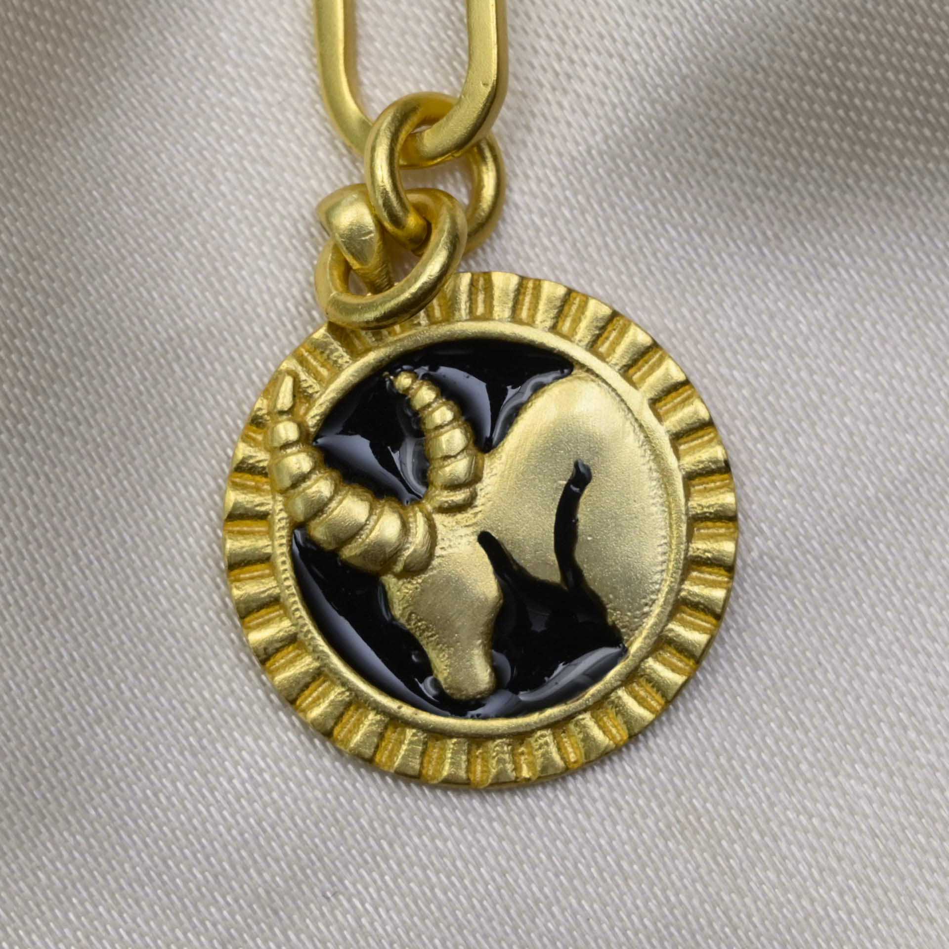 This is a 22kt gold dipped link lariat necklace with enamelled medallions and sculptured motifs of "The Bull" - symbol of Taurus. The necklace can be worn in three ways. It establishes a talismanic connect, is a reminder of traits and inspires to reach your greatest potential.