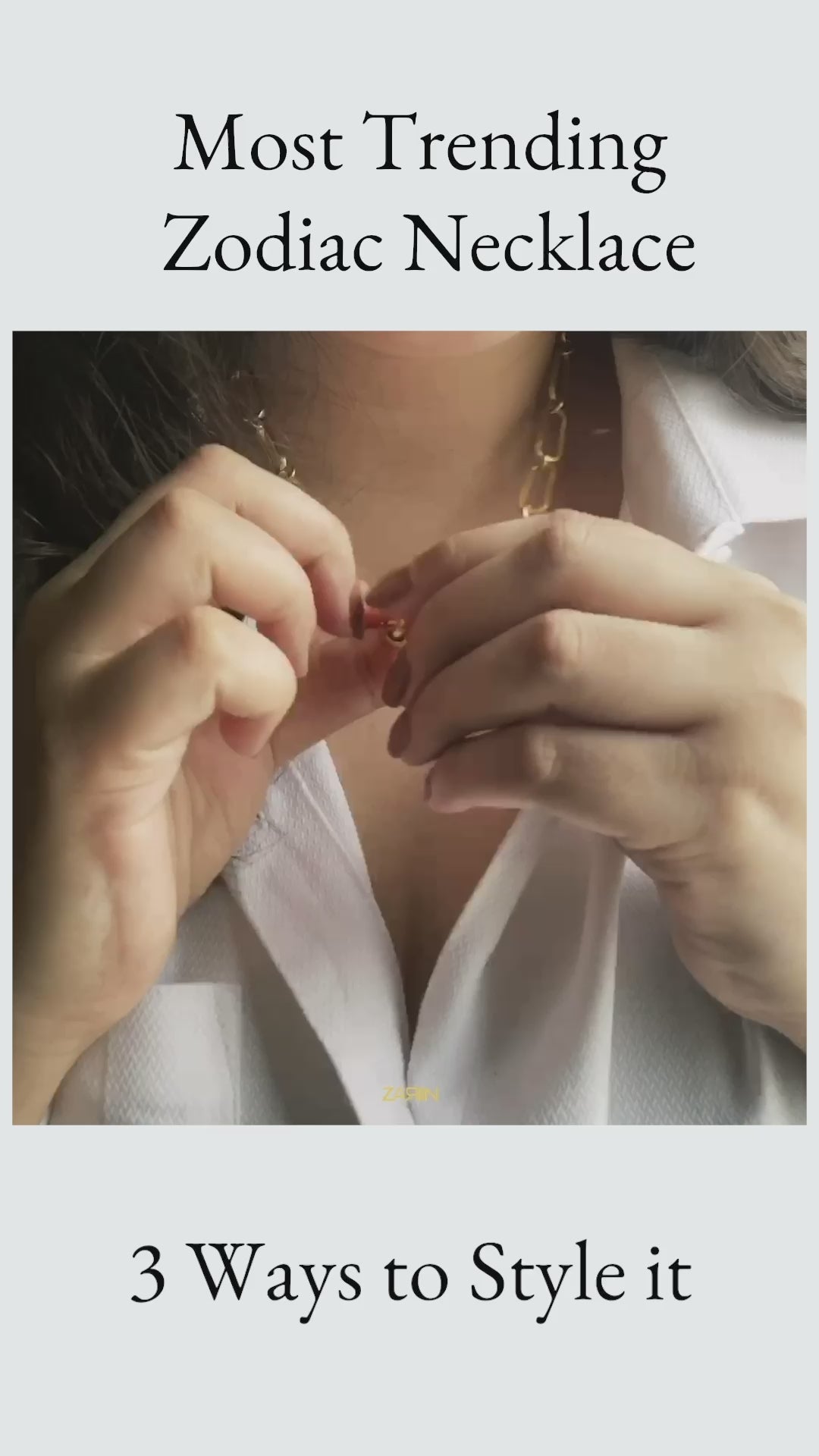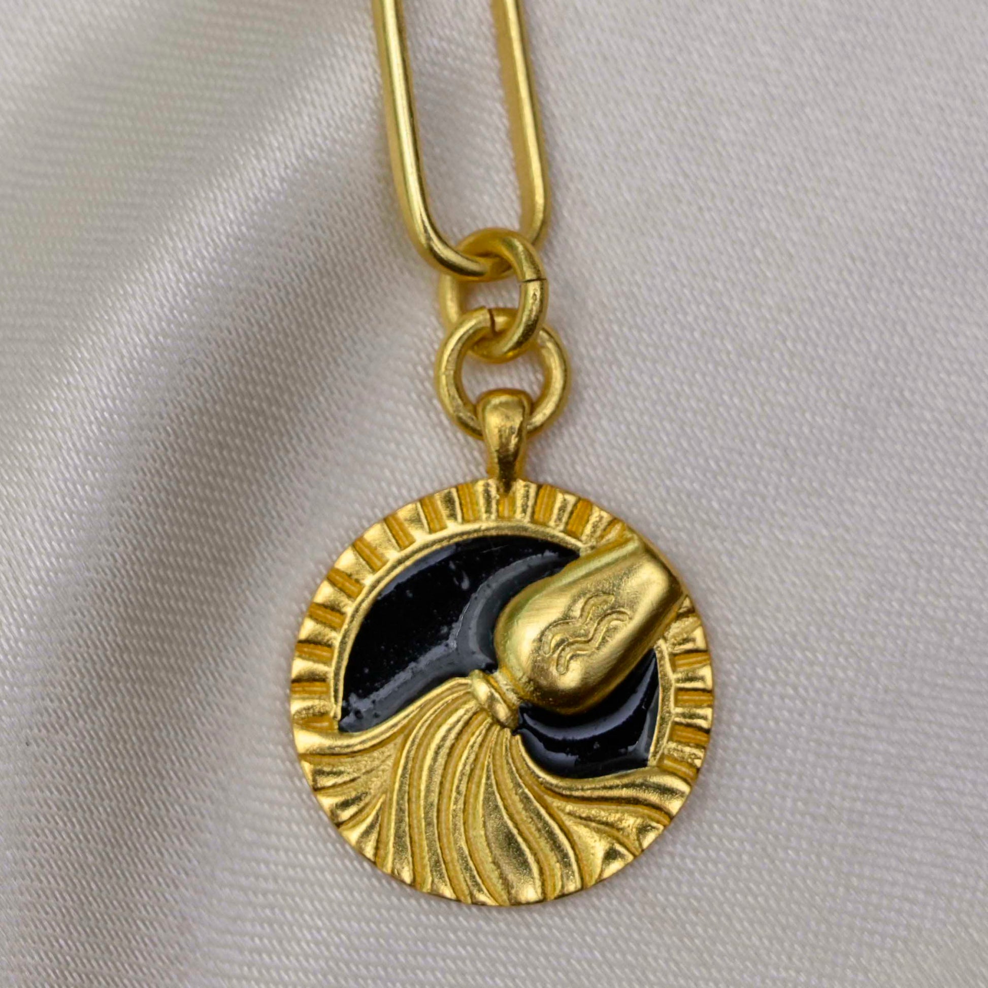 This is a 22kt gold dipped link lariat necklace with enamelled medallions and sculptured motifs of "The Water Bearer" - symbol of Aquarius. The necklace can be worn in three ways. It establishes a talismanic connect, is a reminder of traits and inspires to reach your greatest potential.