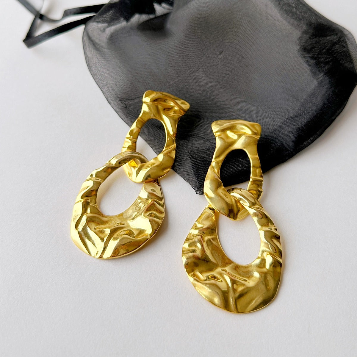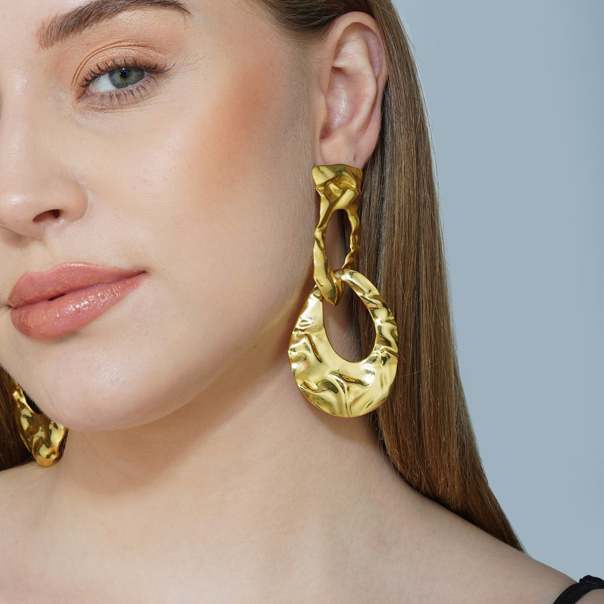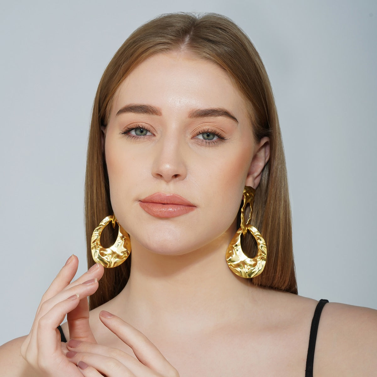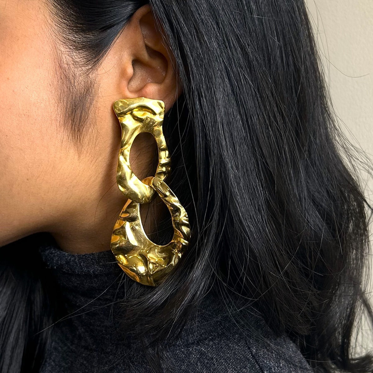 22kt gold plated chunky link earrings. An effortless pair of party perfect, statement earrings that grace your outfit with ultimate style and glam. The links lend a contemporary flair to the earrings celebrating the modern touch and the all gold tonal look makes it easy to style and wear as all gold goes with almost anything. Keep it simple yet bold with these earrings and pair with an all gold tonal cuff bracelet or statement look for a bolder impact..